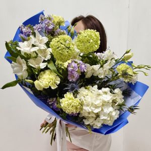 Готовый букет с гортензией, вибурнумом и альстромерией