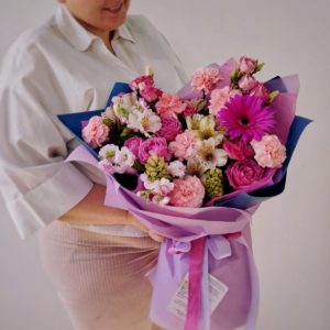 Готовый букет с гиацинтами, маттиолой, нежной кустовой розой, стойкой альстромерией и эустомой