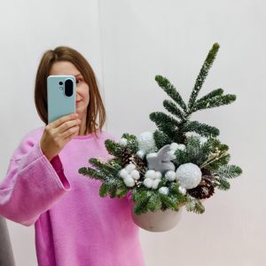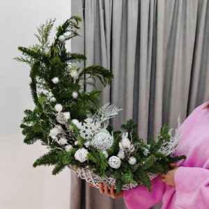 Новогодняя композиция «Лодка» с голубой елью | Белый декор и сухоцветы