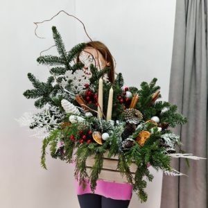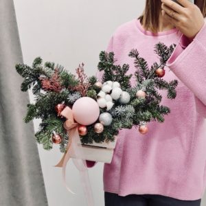 Новогодняя композиция в деревянном ящике 50/40 см | Голубая ель, розовые шары