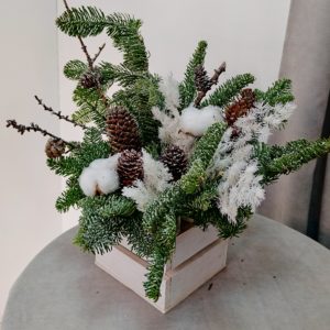 Готовая композиция в деревянном ящике | Шишки, хлопок, аспарагус | Доставка от 40 минут
