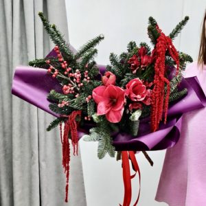 Яркий зимний букет с амариллисом 60/70 см | Голубая ель и ягоды | Доставка за 30 минут