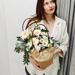 В НАЛИЧИИ, собрана в размере 20*23 см Букет упакован в стильную фирменную коробку с крышкой, с полной защитой от перепадов погоды (жара, мороз, ветер или дождь — заказывайте букет в любую погоду)! В комплекте с букетом мы прилагаем инструкцию по уходу за букетом и средство для продления жизни цветов.
