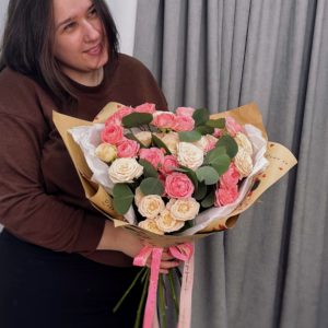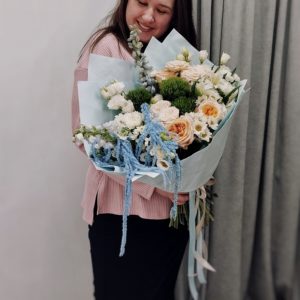 Мы оставляем за собой право определять состав букета, поскольку очень придирчиво относимся к качеству цветка и выбираем только безупречно свежие сорта, которые есть в наличии у поставщиков в данный момент. Указанные размеры букетов и композиций являются приблизительными. Реальный размер цветочных композиций может отличаться на 3-5см.