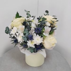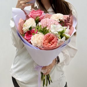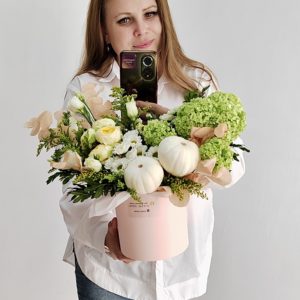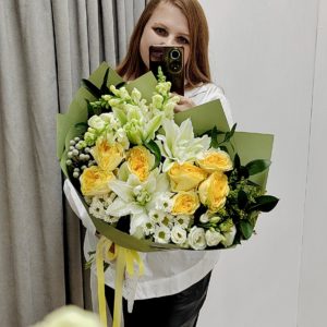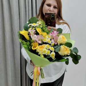 Мы оставляем за собой право определять состав букета, поскольку очень придирчиво относимся к качеству цветка и выбираем только безупречно свежие сорта, которые есть в наличии у поставщиков в данный момент. Указанные размеры букетов и композиций являются приблизительными. Реальный размер цветочных композиций может отличаться на 3-5см.