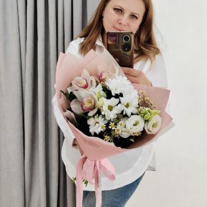 Готовый букет с орхидеями, ромашкой и хризантемой