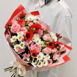 И еще! Для зрелых женщин следует остановиться на крупных цветах с яркими и сочными оттенками (алый, краплак, малиновый, оранжевый и т. д.). Зрелым и пожилым женщинам обязательно создадут настроение праздника минималистические букеты с крупными соцветиями.