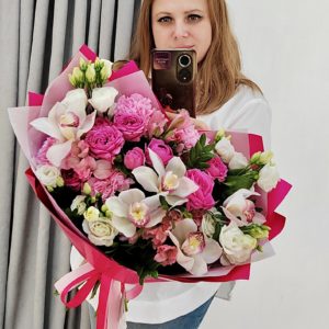 Готовый букет с орхидеями, кустовой пионовидной розой и эустомой