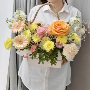 В НАЛИЧИИ, собран в размере 45*50 см Букет упакован в стильную фирменную коробку с крышкой, с полной защитой от перепадов погоды (жара, мороз, ветер или дождь — заказывайте букет в любую погоду)! В комплекте с букетом мы прилагаем инструкцию по уходу за букетом и средство для продления жизни цветов.