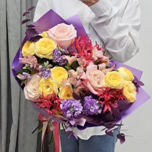 Мы оставляем за собой право определять состав букета, поскольку очень внимательно относимся к качеству цветка и выбираем только безупречно свежие сорта, которые есть в наличии у поставщиков в данный момент. Указанные размеры букетов и композиций являются приблизительными. Реальный размер цветочных композиций может отличаться на 3-5см.