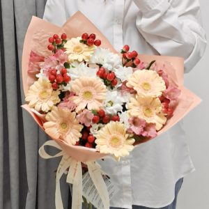 Готовый букет с кремовой герберой мини и красными ягодами | Доставка 30 минут | Бердск