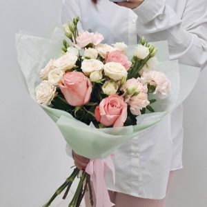 Готовый букет с розами и эустомой в мятной упаковке | Доставка за 30 минут | Бердск