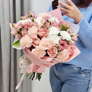 Готовый букет в нежной гамме с розами, хризантемой, гвоздиками и альстромерией | Доставка цветов Бердск