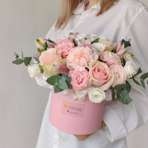 Ваша избранница использует румяна? Она любит выглядеть красиво? Тогда подарите ей больше красоты. Сделать это можно посредством букета «Румяна». Нежность, сдержанность, намек на чистоту и совершенство – все это обеспечено сочетанием роз, альстромерий, гвоздики, эустомы и эвкалипта. Они погружены в шляпную коробку нейтрального цвета, дополняющую композицию и делающую ее безупречной.