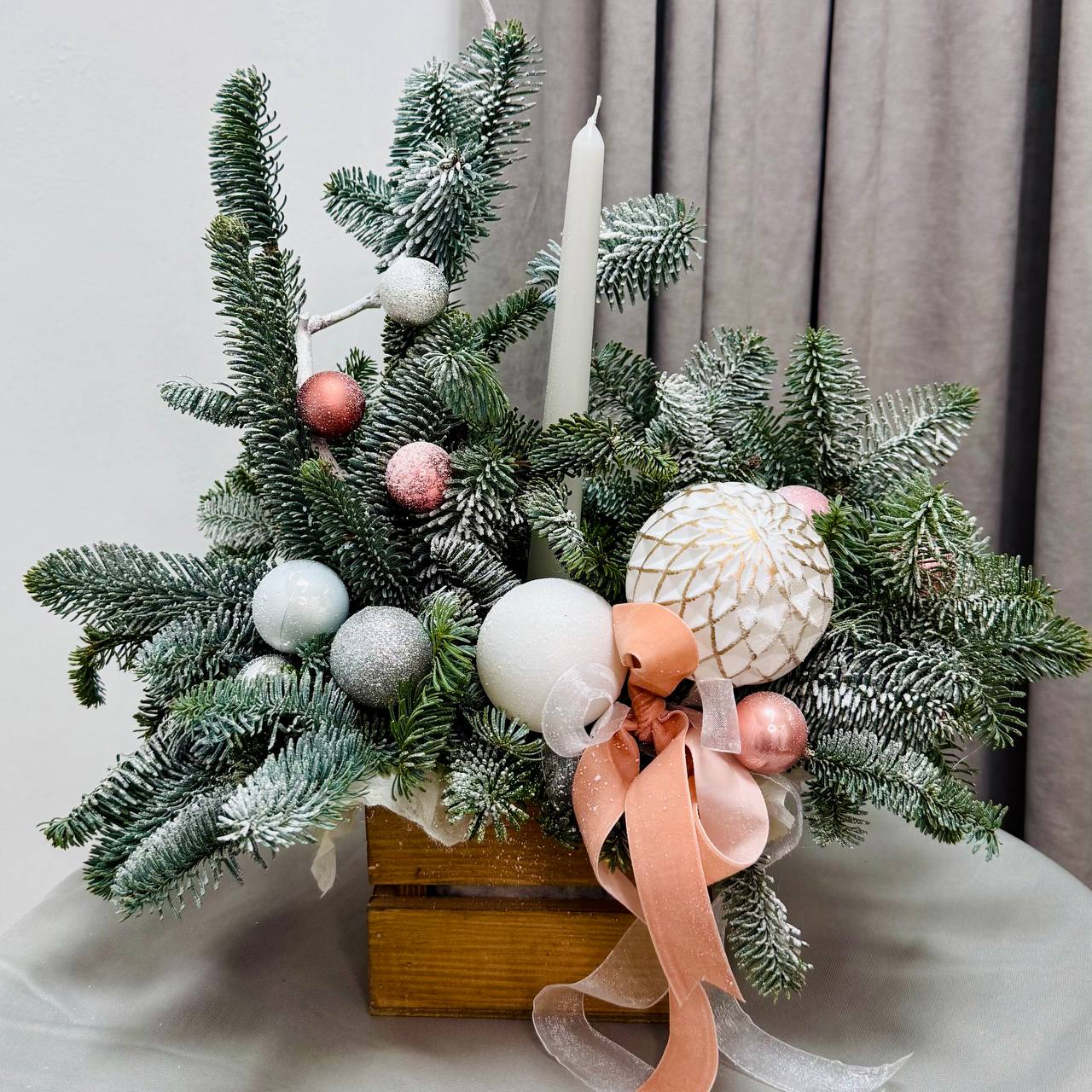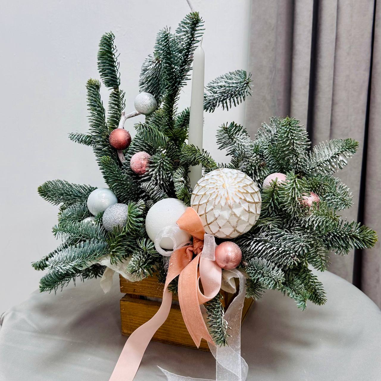Красивая зимняя композиция в деревянном ящике с новогодним декором и свечой. Прекрасный подарок в предверии праздника чтобы родной и любимый человек настроился на праздничную атмосферу и настроение.