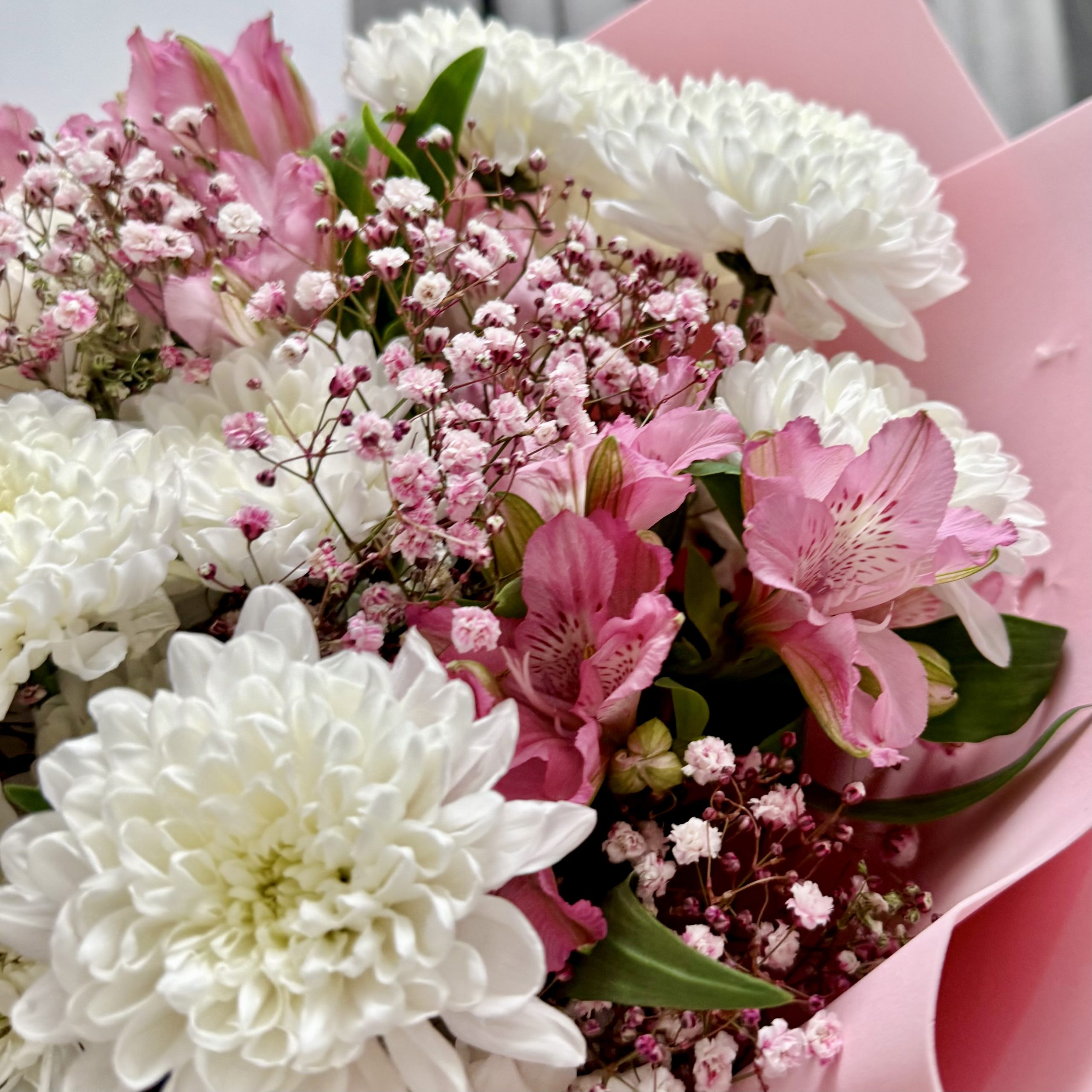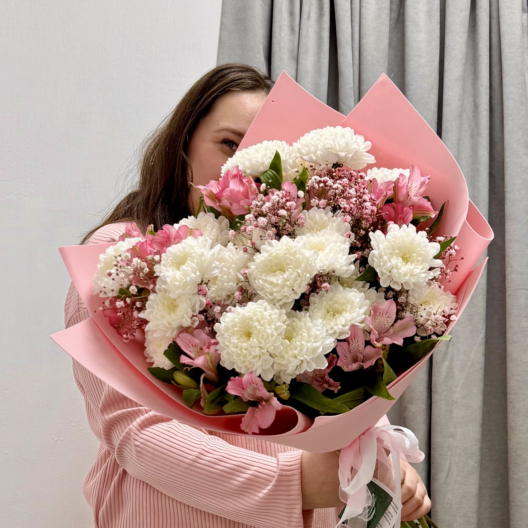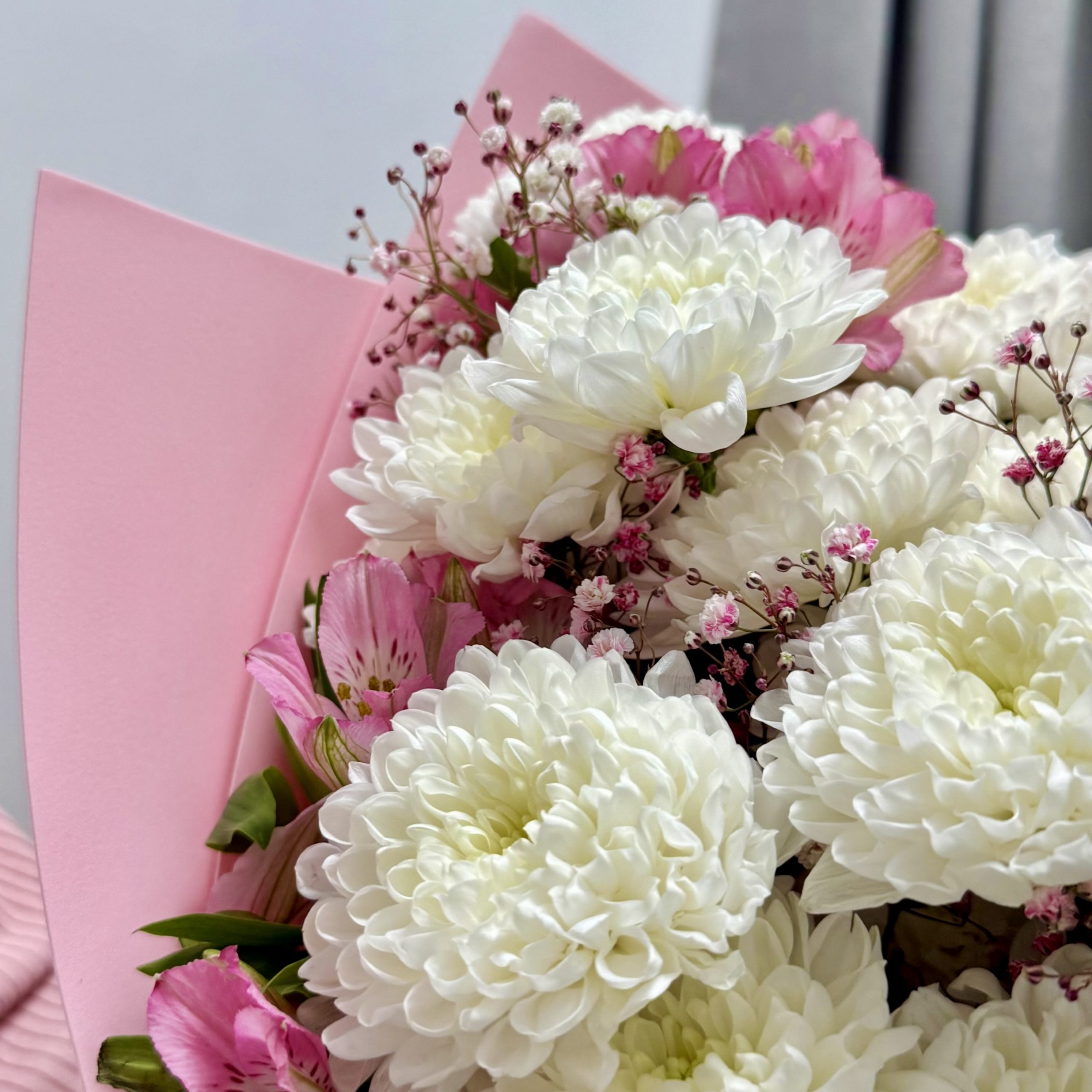 Готовый стойкий букет для мамы с хризантемой, альстромерией и гипсофилой