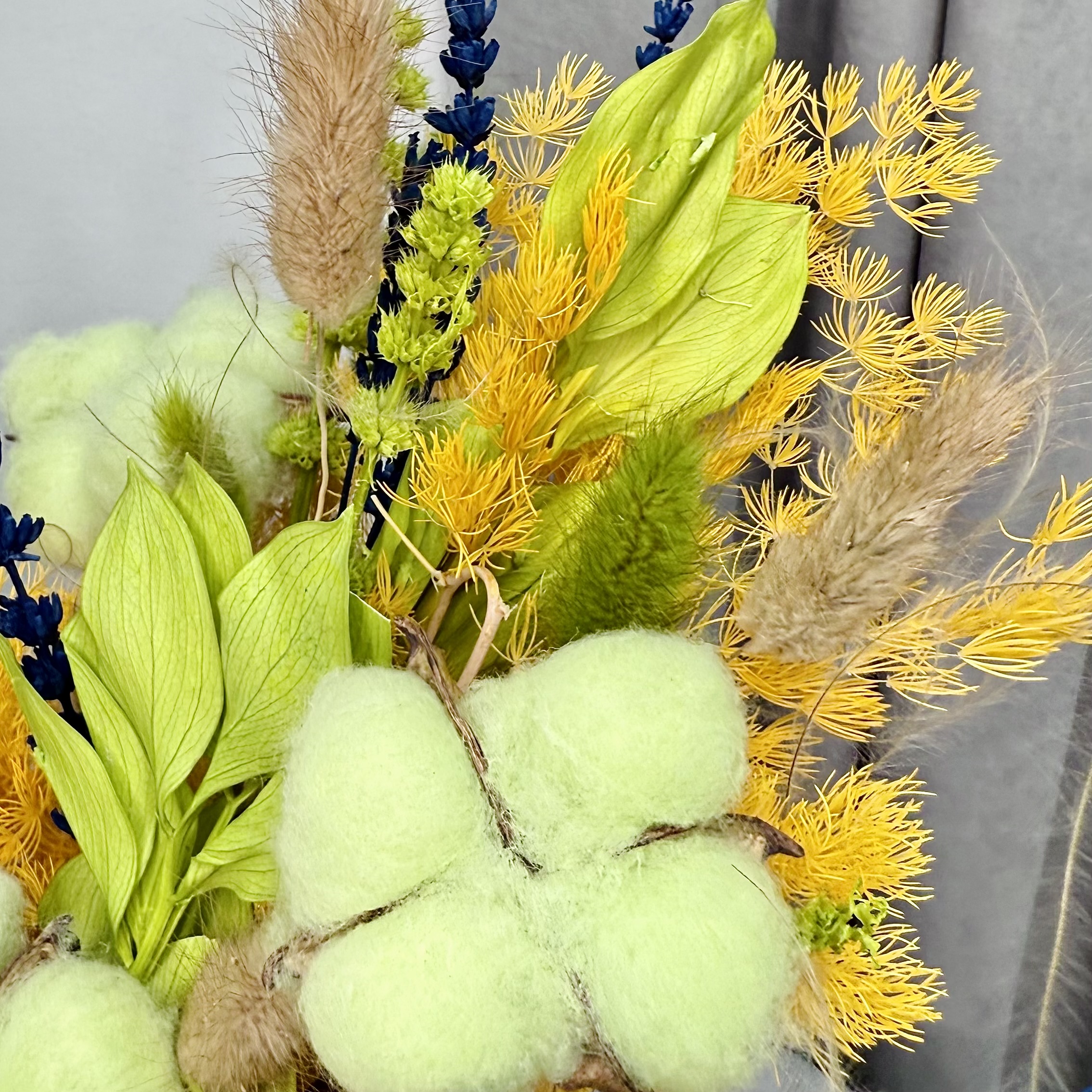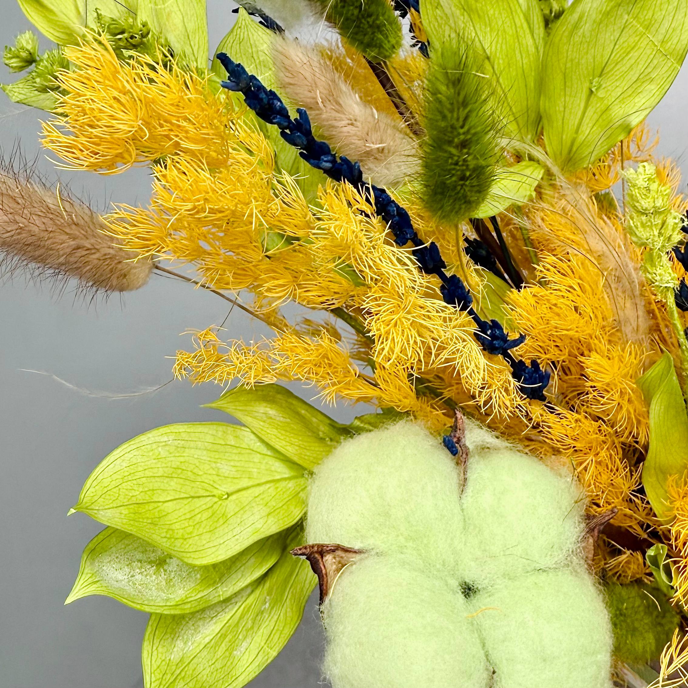 Красивая авторская композиция (букет) из сухоцветов, стабилизированных цветов и хлопка.
