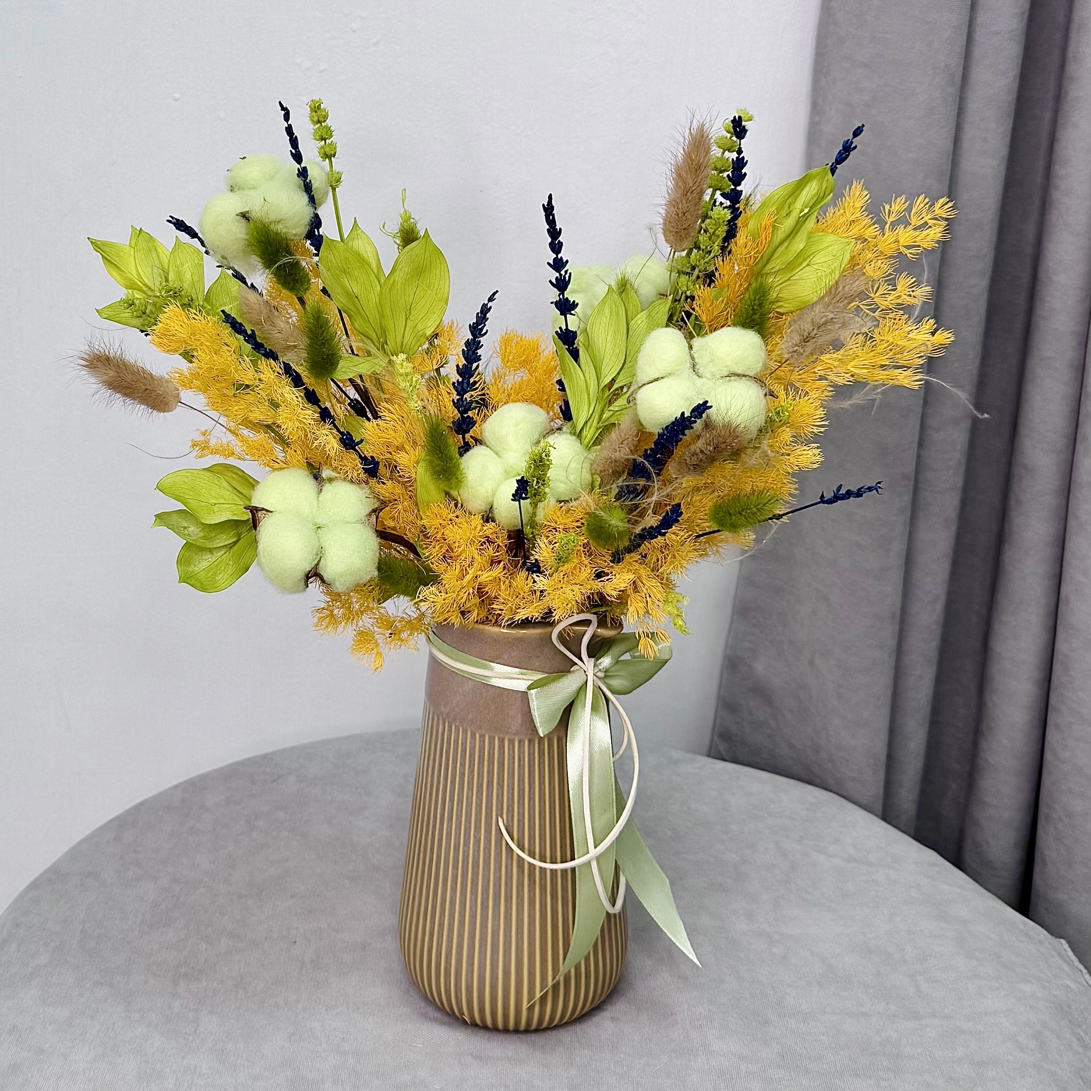 Нежный букет из сухоцветов в керамической вазе. Прекрасное украшение и декор для дома. Компактный размер букета из сухоцветов позволит поставить вазу в любое место в доме.