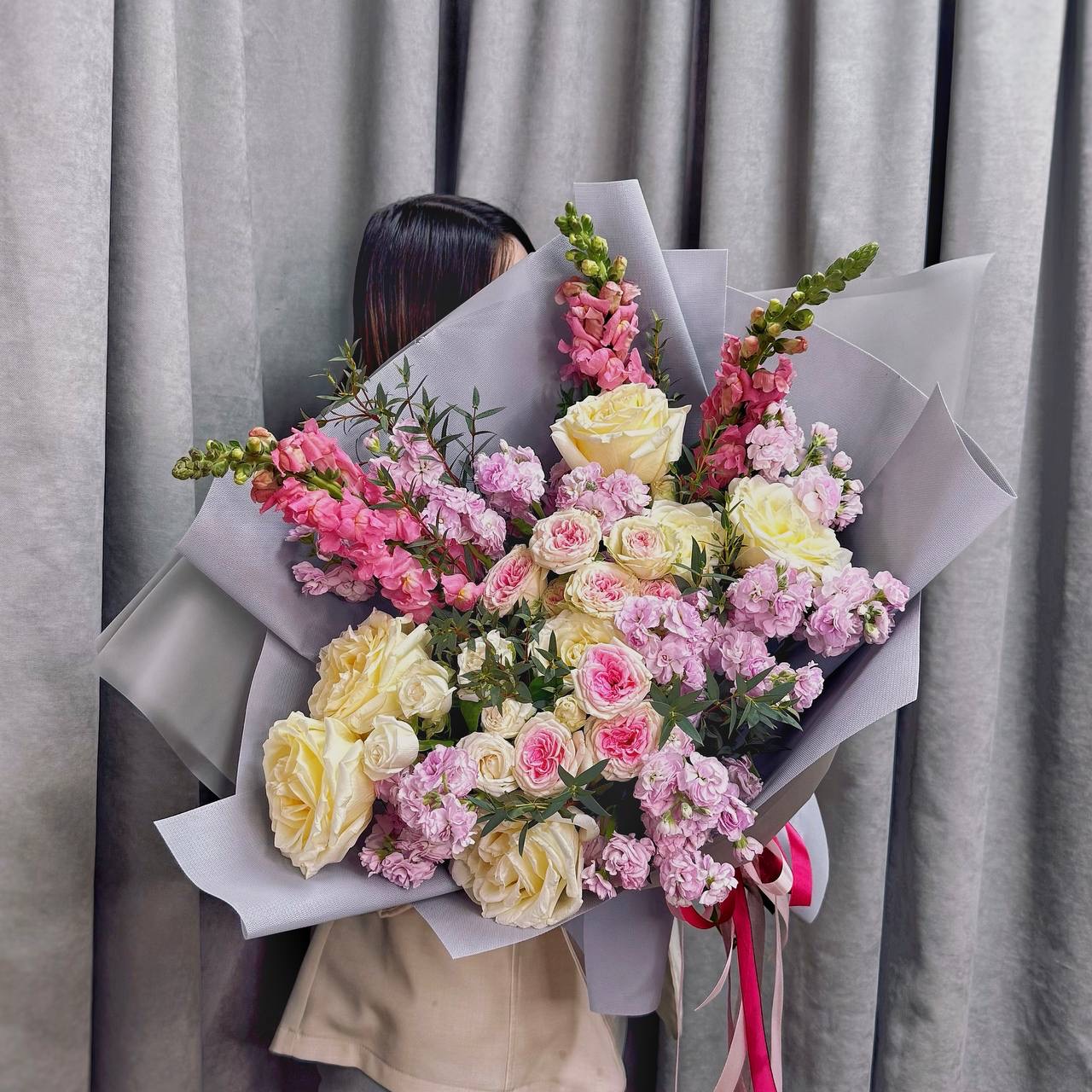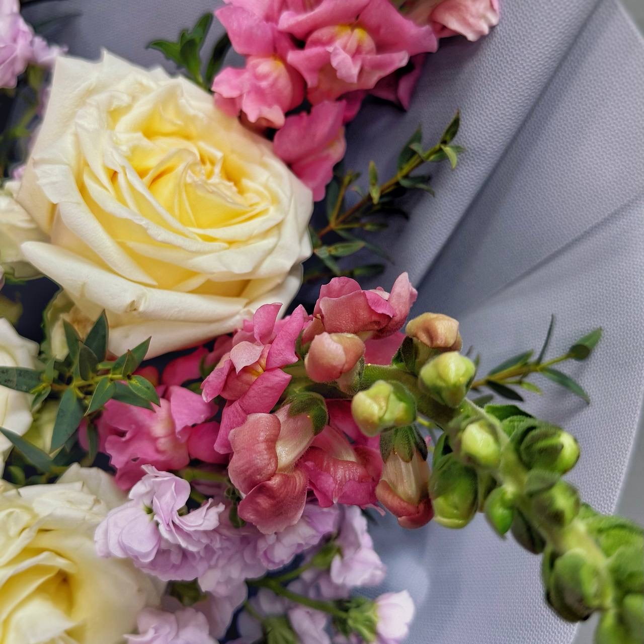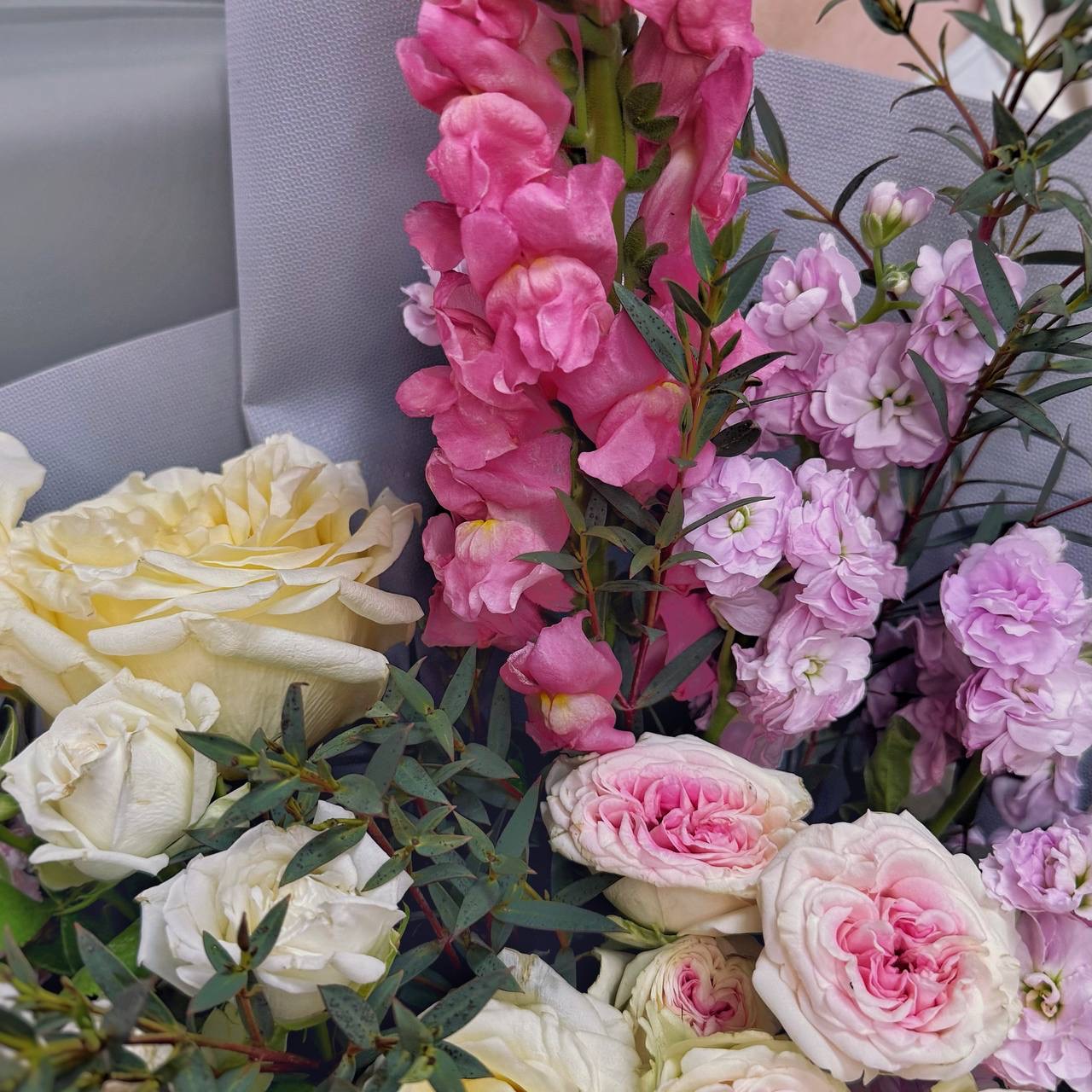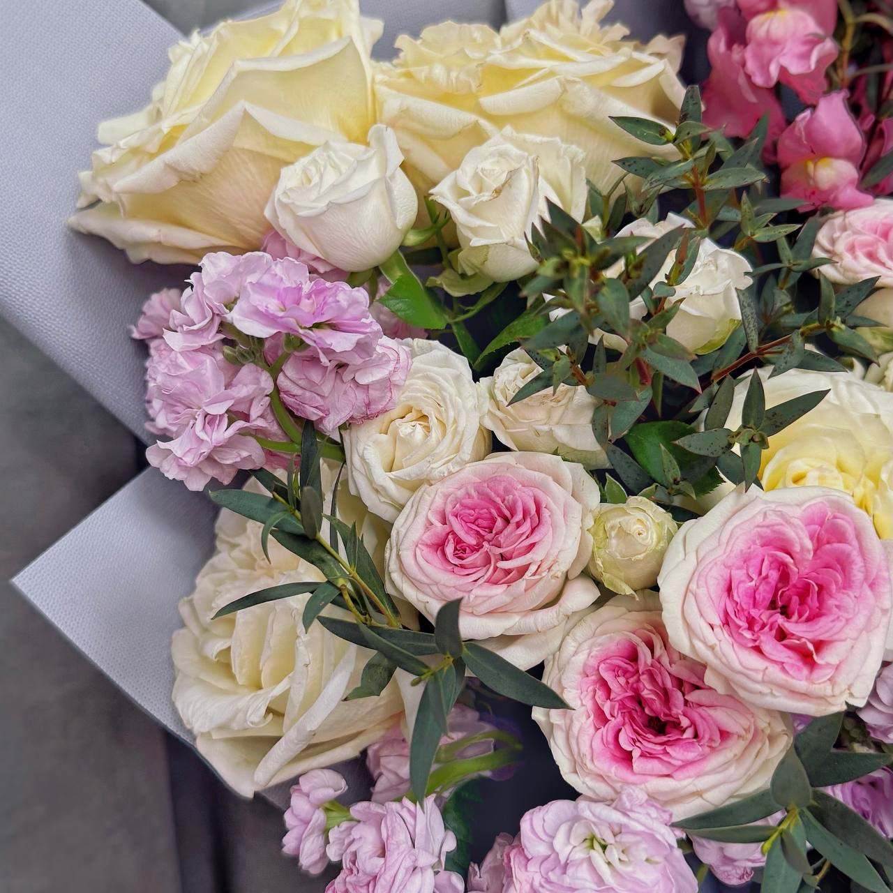· Ароматная маттиола — душистая изюминка букета. Её сладкий, пряный аромат наполняет комнату атмосферой романтики и праздника. Маттиола делает букет по-настоящему живым и запоминающимся.