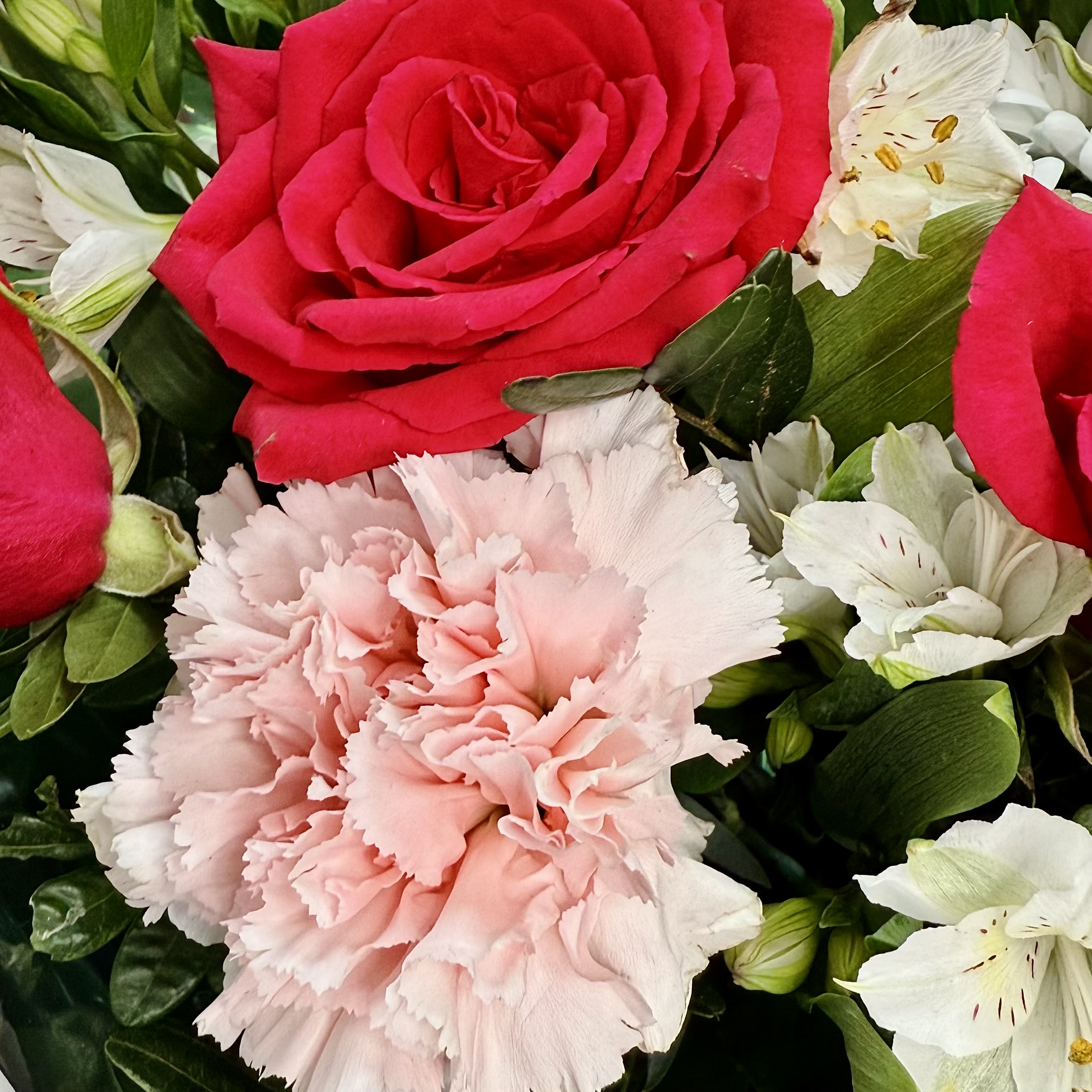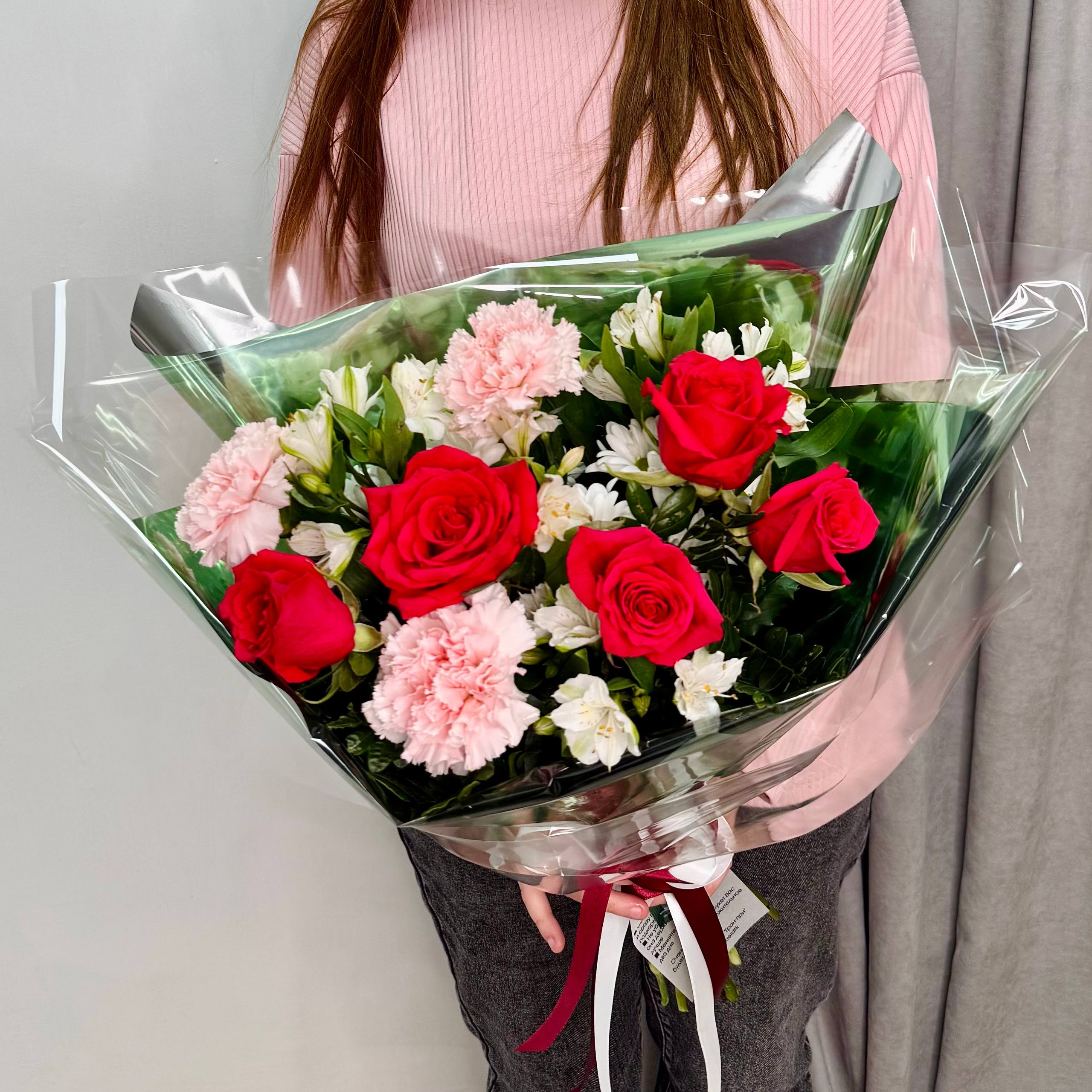 Букет с малиновыми розами, альстромерией и гвоздикой | Стильная упаковка | Доставка 40 минут