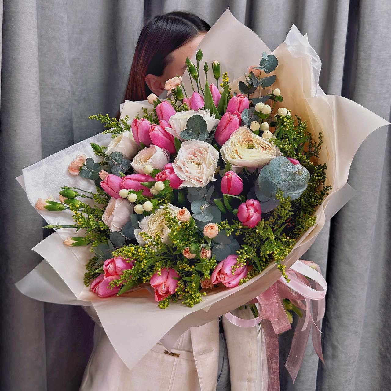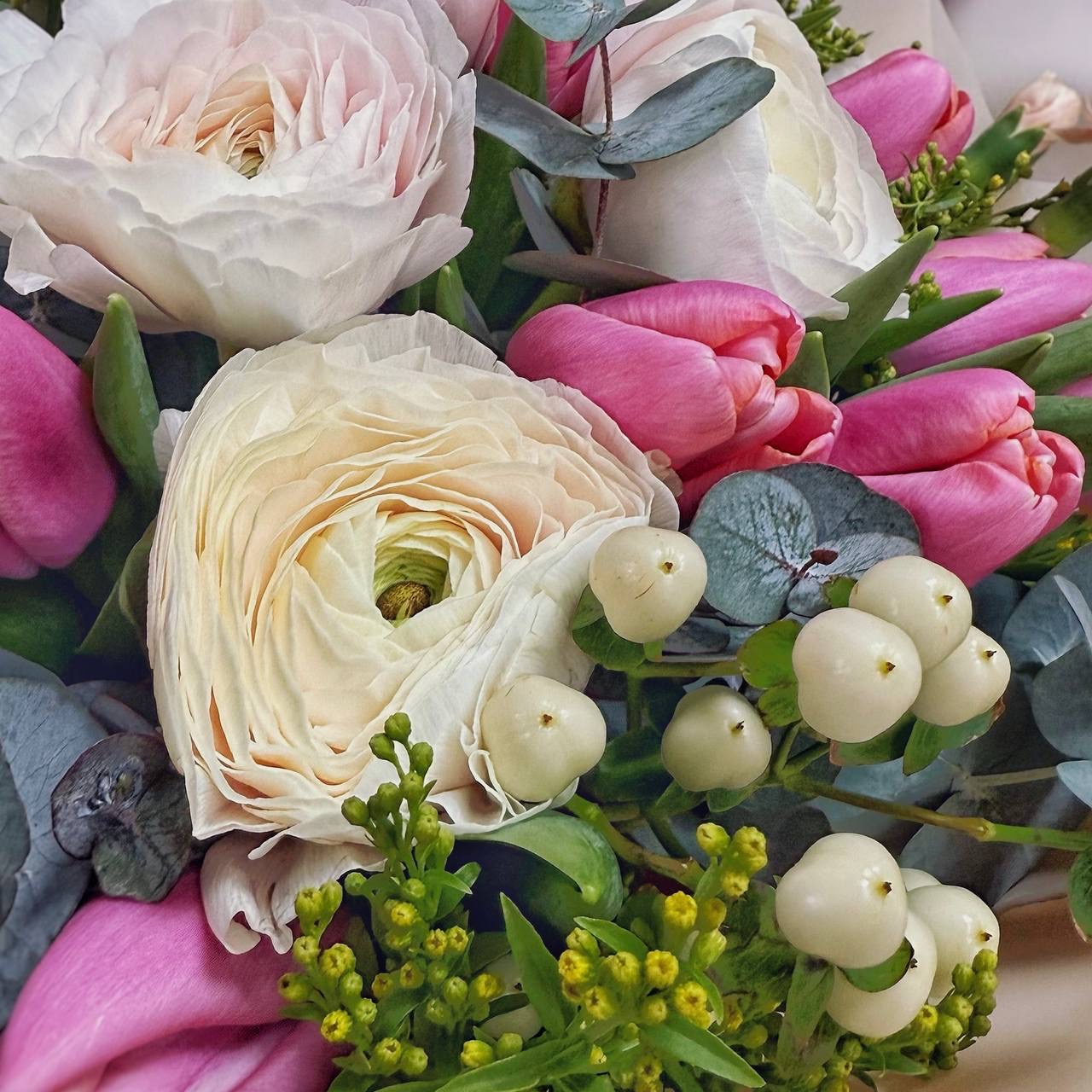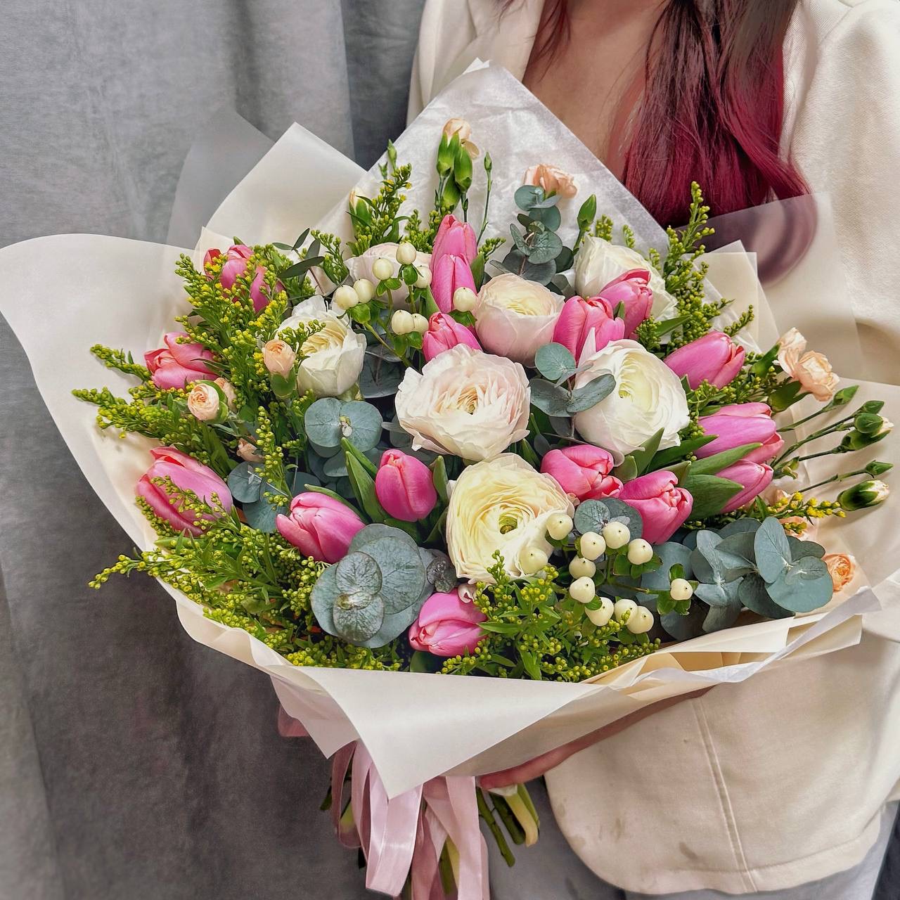 Хотите подарить букет, который выглядит как картина и дарит весеннее настроение? В цветочном салоне «Гран При» в Бердске вас ждёт готовая композиция, в которой сочетаются трогательная нежность ранункулюсов, классическая красота розовых тюльпанов и яркие акценты солнечной зелени.