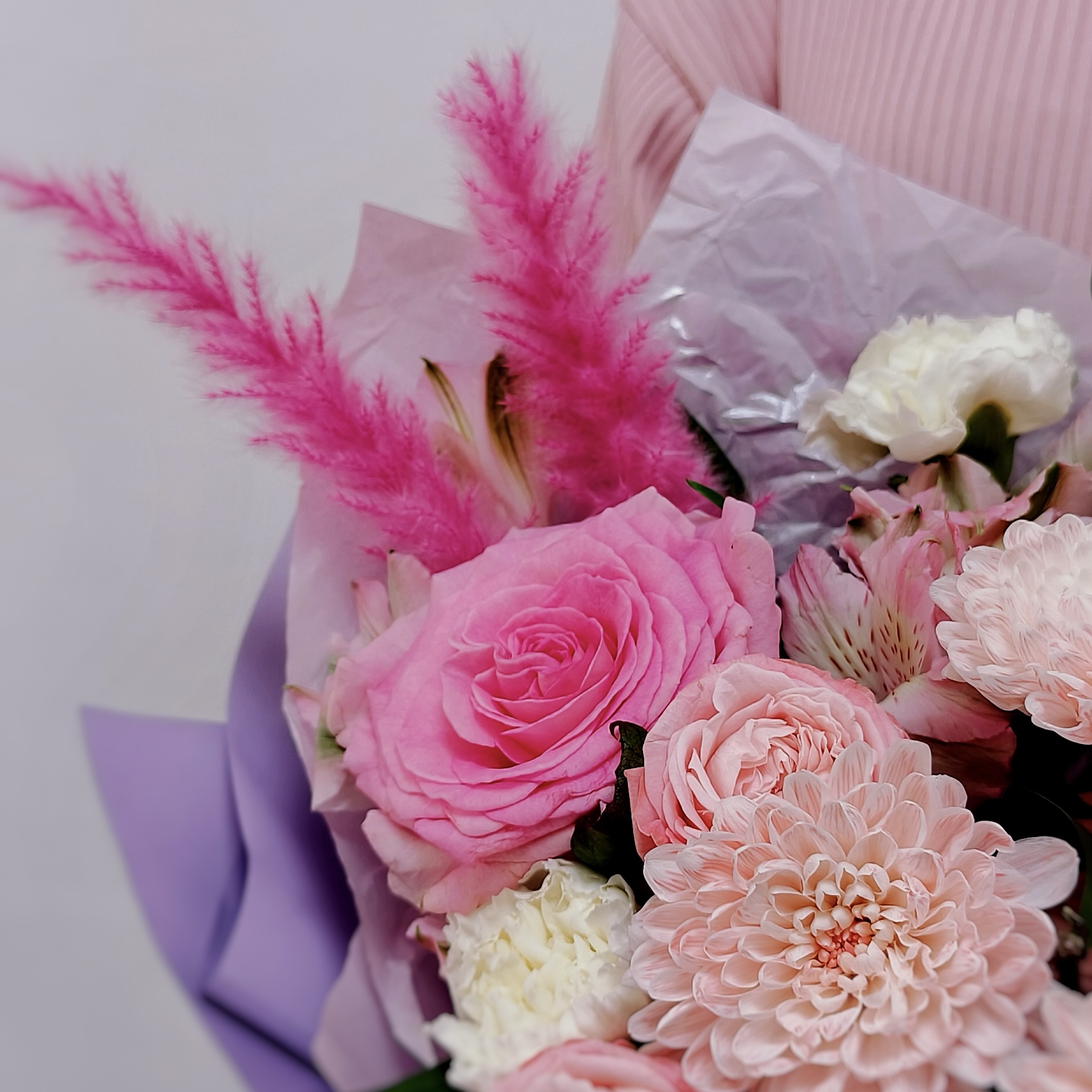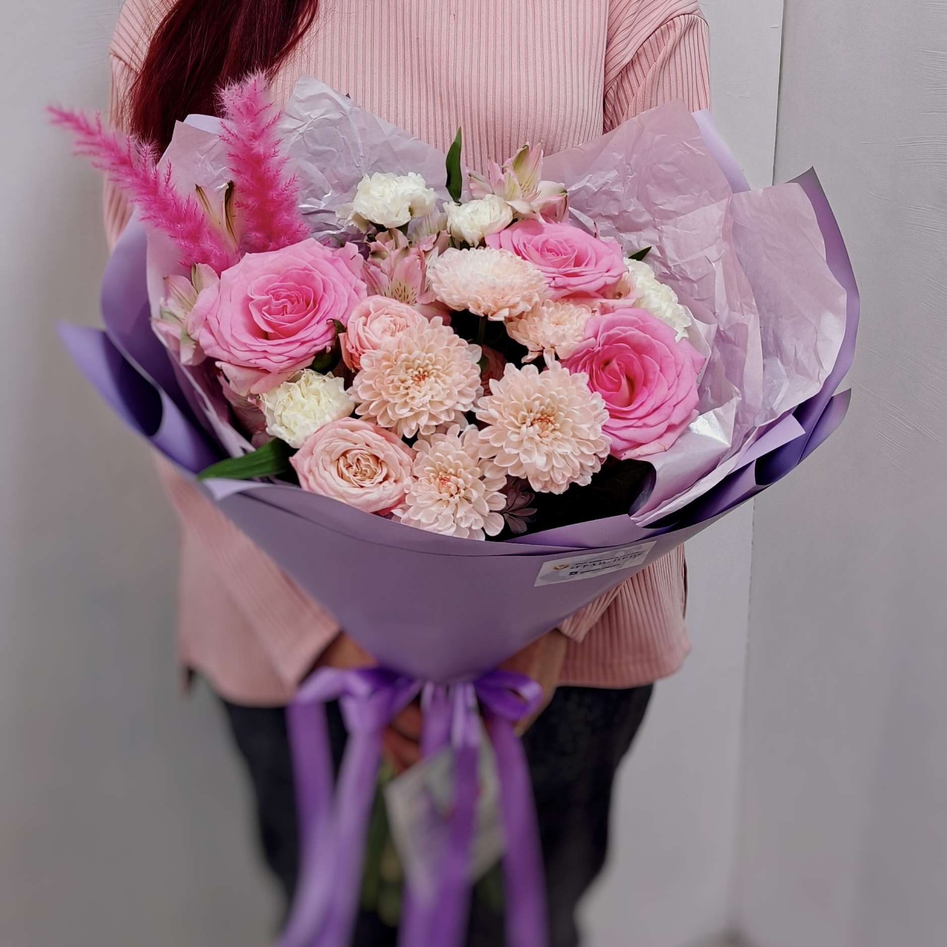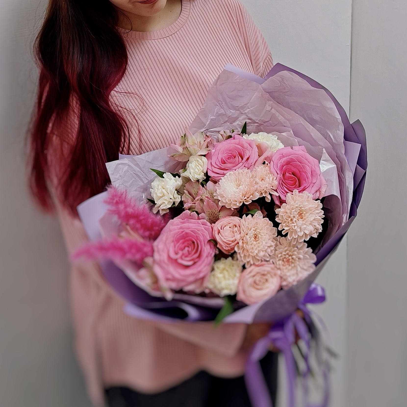 Сиреневый цвет символизирует искренность, мечтательность и вдохновение. Этот букет станет идеальным подарком для творческой личности, на свидание, юбилей или просто как знак внимания без повода