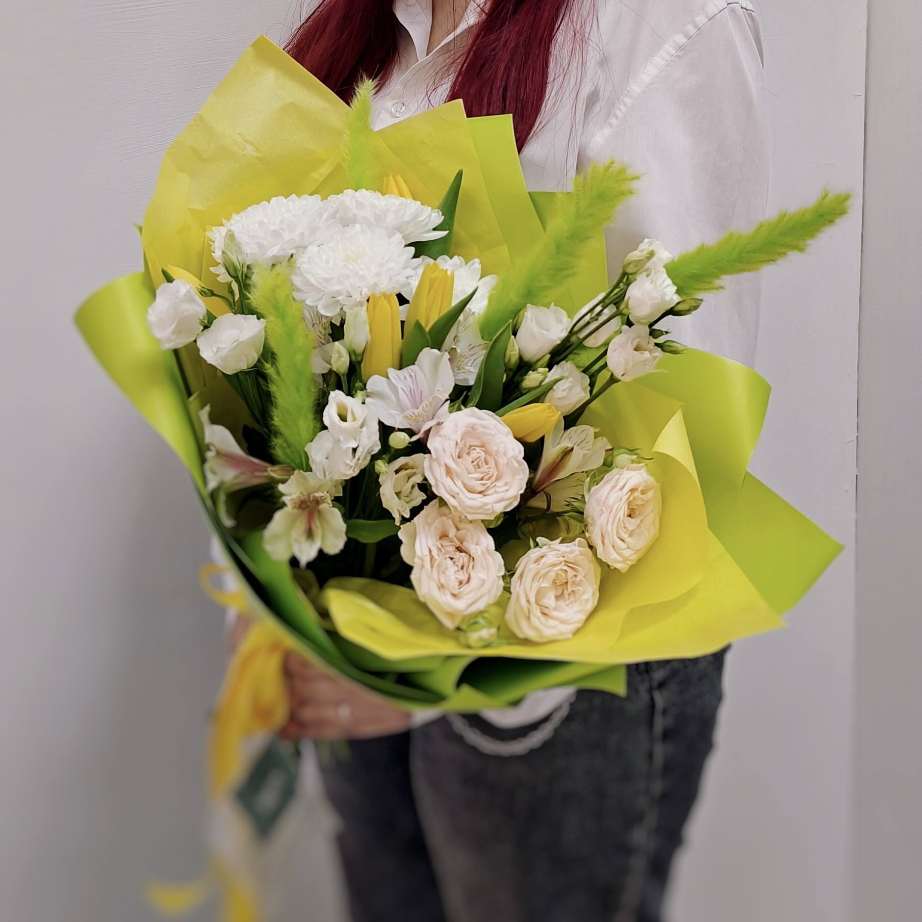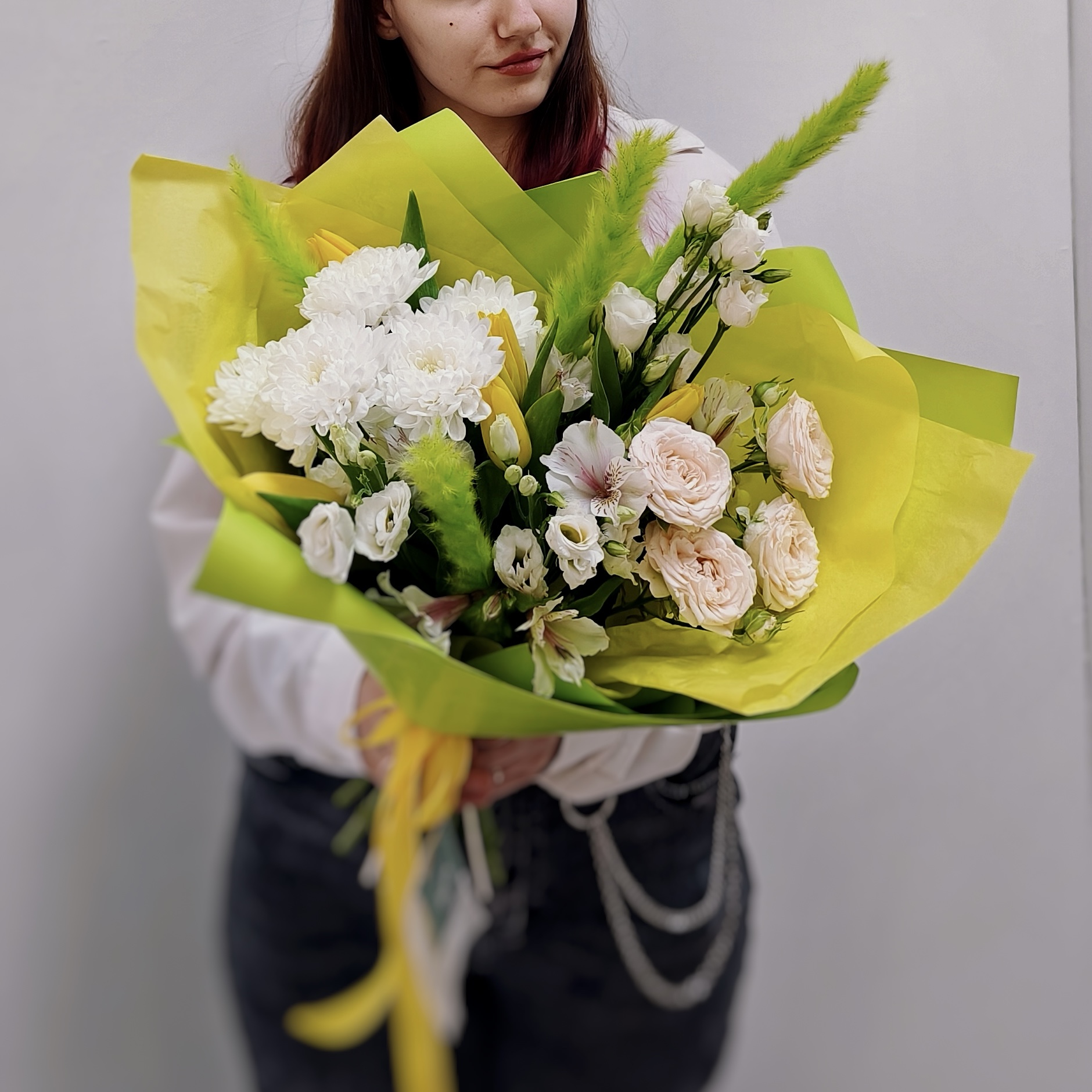 Яркий весенний букет с солнечными тюльпанами, нежной кустовой розой и пышной хризантемой