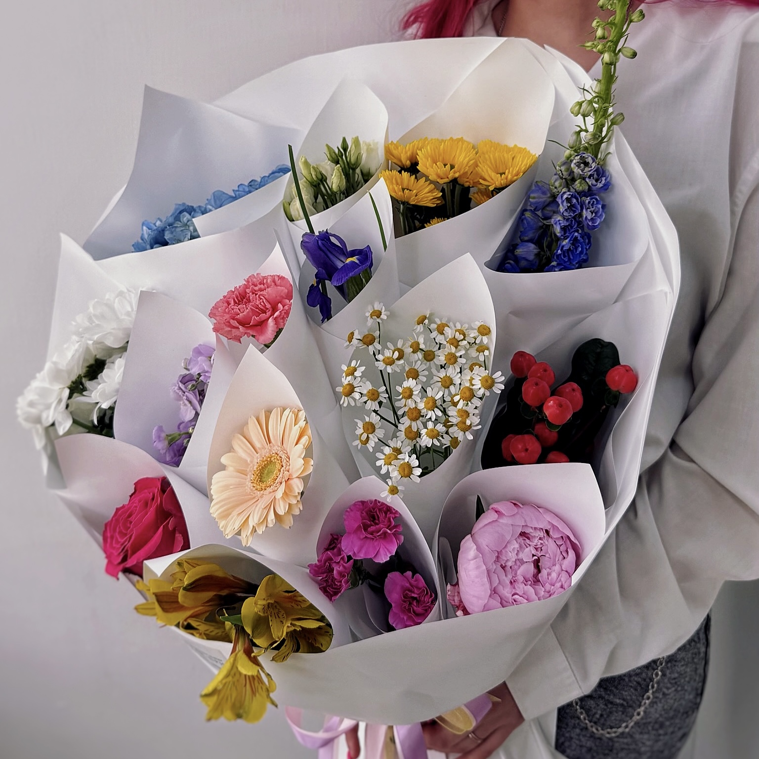 Каждая вариация уникальна и неповторима, каждый букет собран в одном экземпляре, неизменно только яркая гамма, общее настроение и стилистика букета. Какой будет ваш? Давайте узнаем вместе!