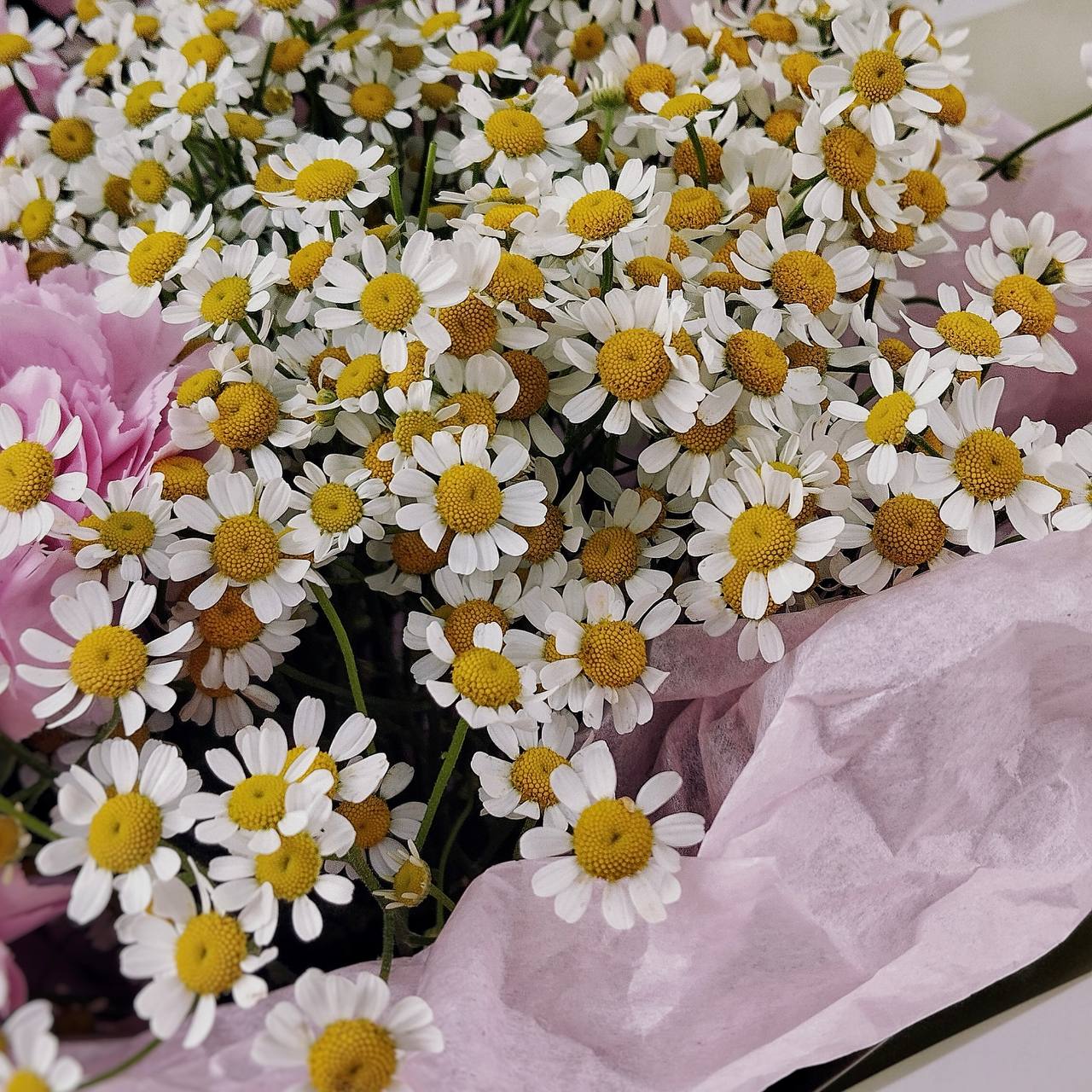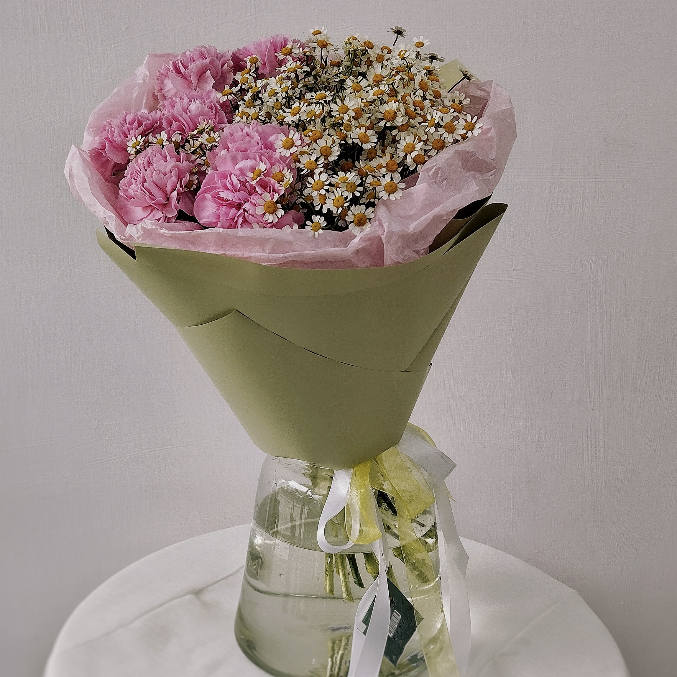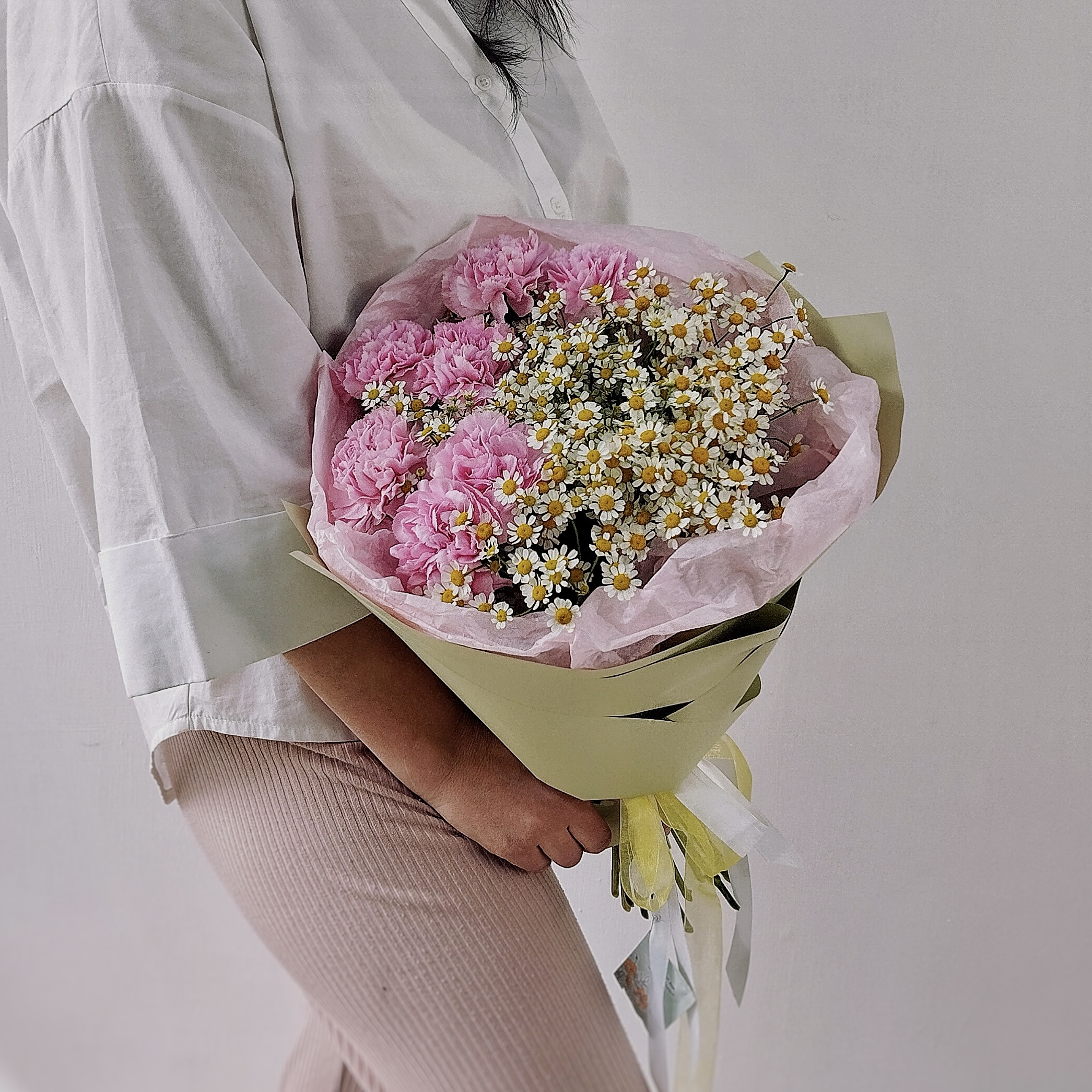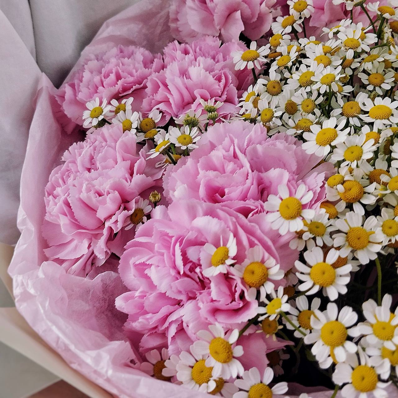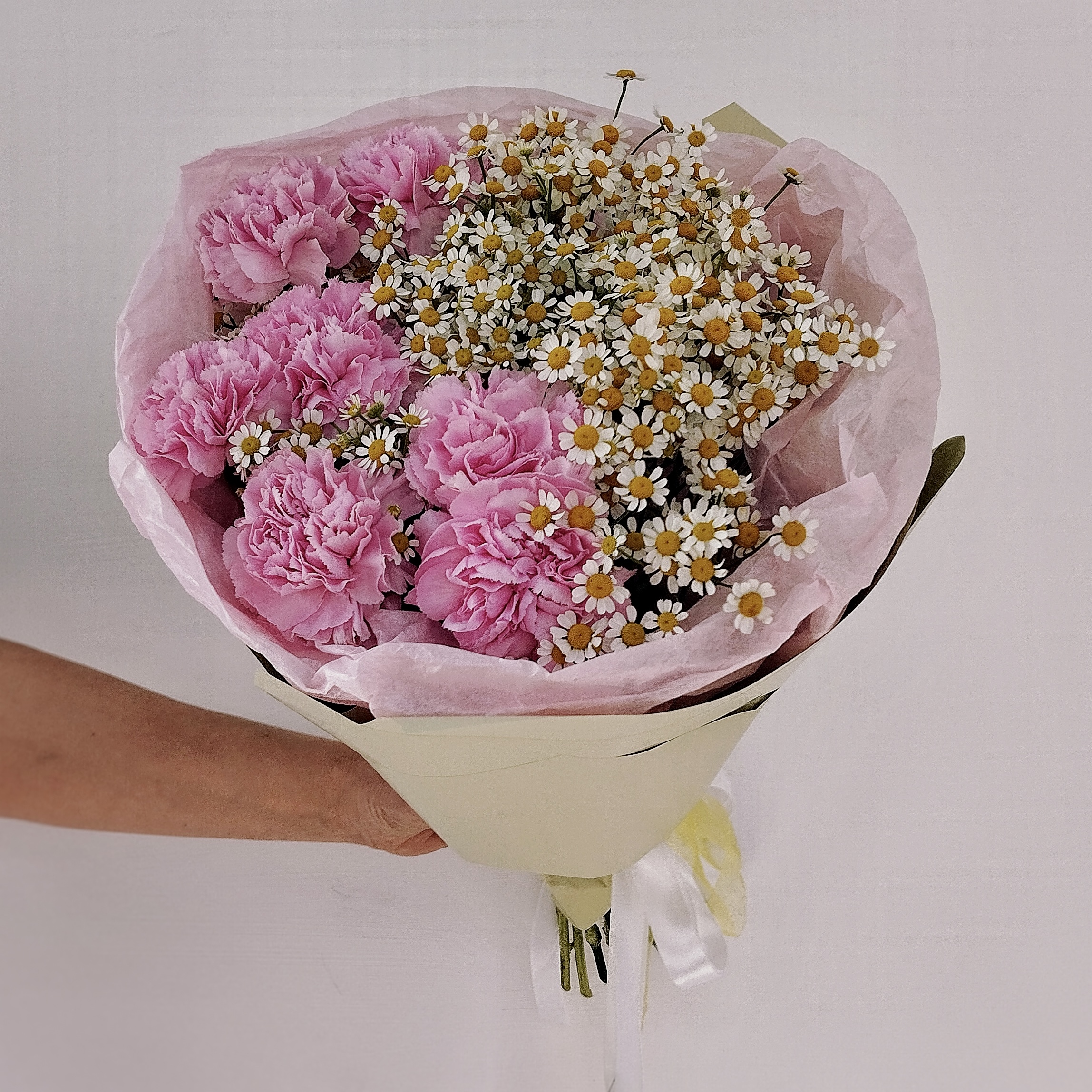 Встречайте новинку нашей постоянной коллекции – дуо-букет «Бабл гам». Стильный, нежный и чуть игривый, как любимая жевательная резинка из детства. В его основе – два главных героя: трогательные розовые одиночные гвоздики, символизирующие искреннюю привязанность, и воздушная кустовая ромашка, дарящая ощущение тепла и беззаботности.