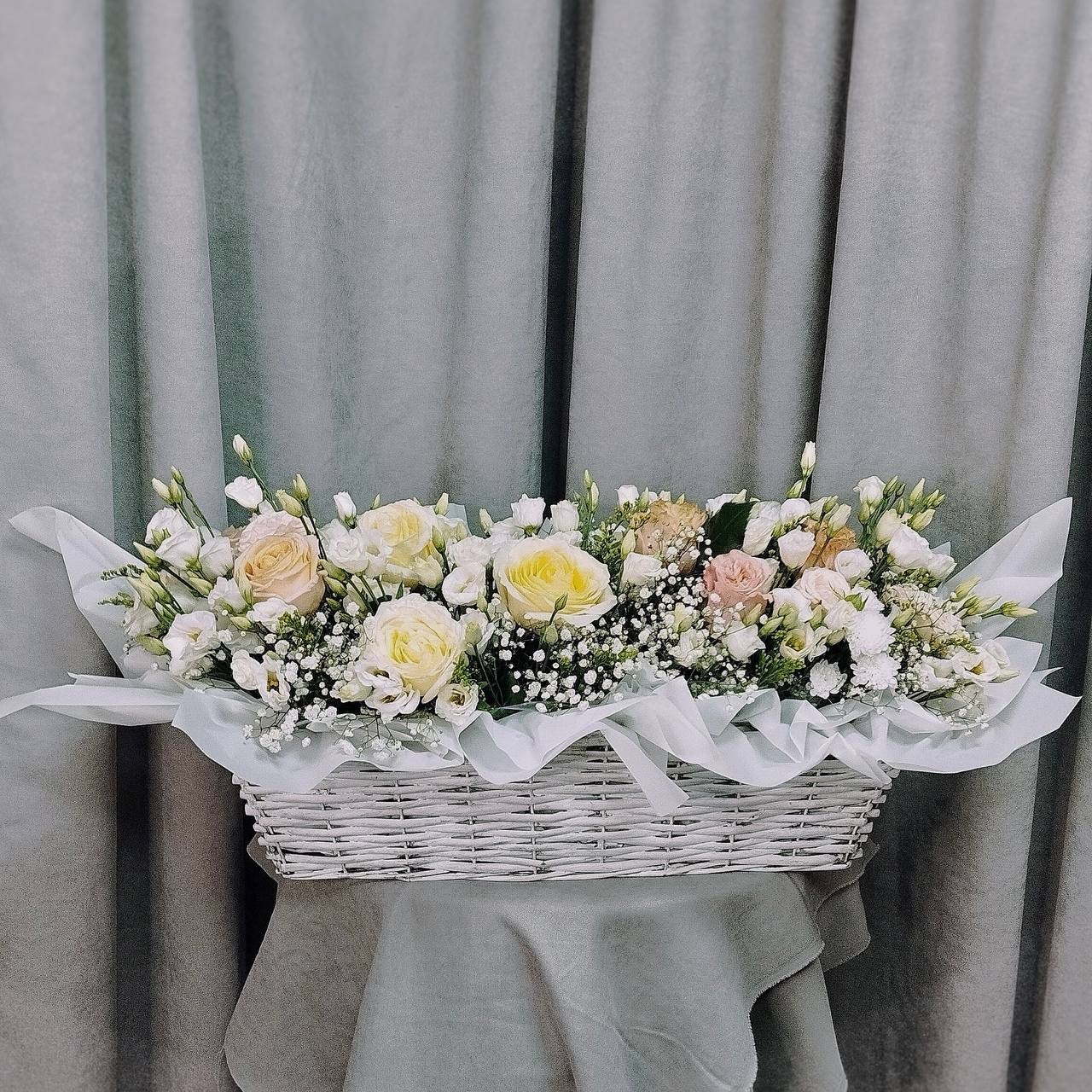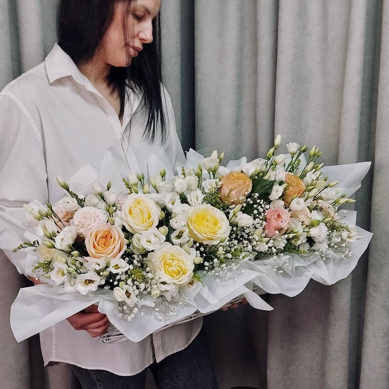Готовая композиция в плетеном кашпо с пионовидными розами разных сортов и эустомой | Размер 80*35 см