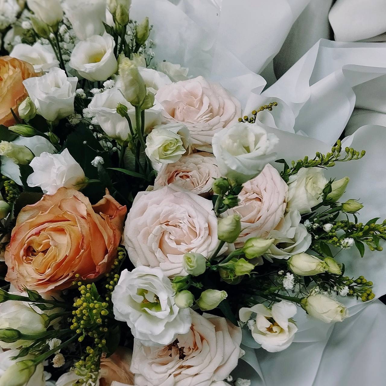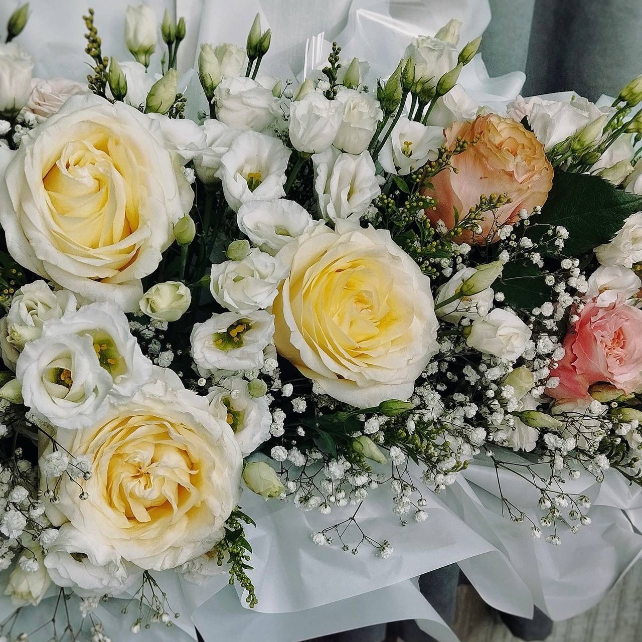 - Белая эустома — изящные цветы, напоминающие нераспустившиеся розы, добавляют композиции благородство и воздушность