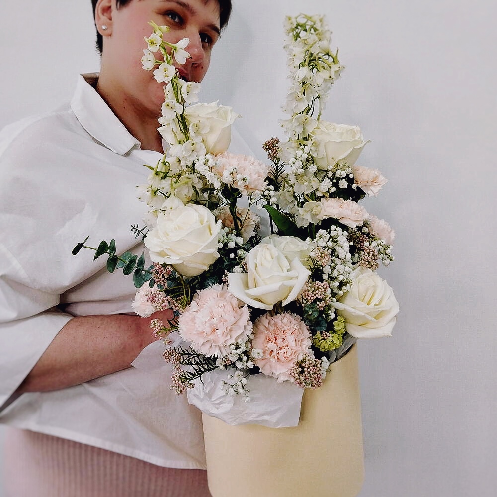 Шляпная коробка, собранная на флористической губке, не требует вазы и становится самостоятельным элементом декора. Кремовая гамма выглядит торжественно и универсально — подходит для любого события: от юбилея и свадьбы до трогательного признания в чувствах.