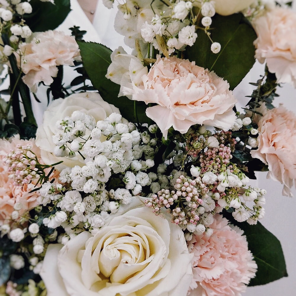 Нежные белые пионовидные розы с их бархатистыми лепестками дарят композиции роскошь и чистоту. Высокие свечи дельфиниума добавляют вертикальную динамику, создавая ощущение лёгкости и воздушности. Стойкие гвоздики обеспечивают долговечность и душевное тепло.