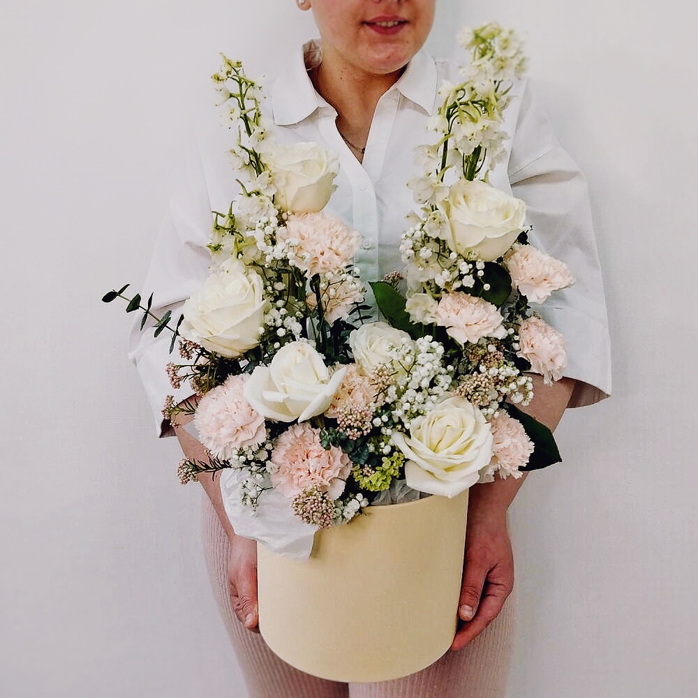 Готовая композиция в шляпной коробке с белыми розами, дельфиниумами и стойкими гвоздиками