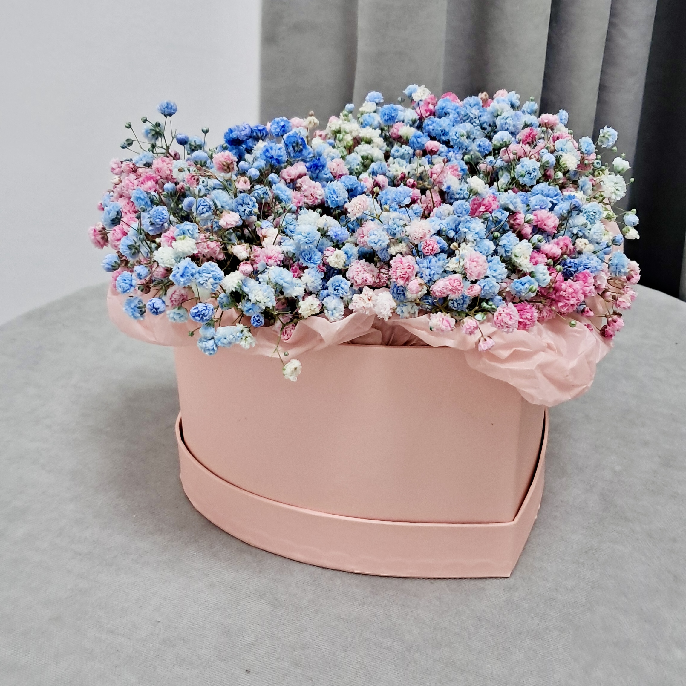 Готовая Композиция в шляпной коробке-сердечке с радужной гипсофилой | Доставка за 40 минут | Бердск