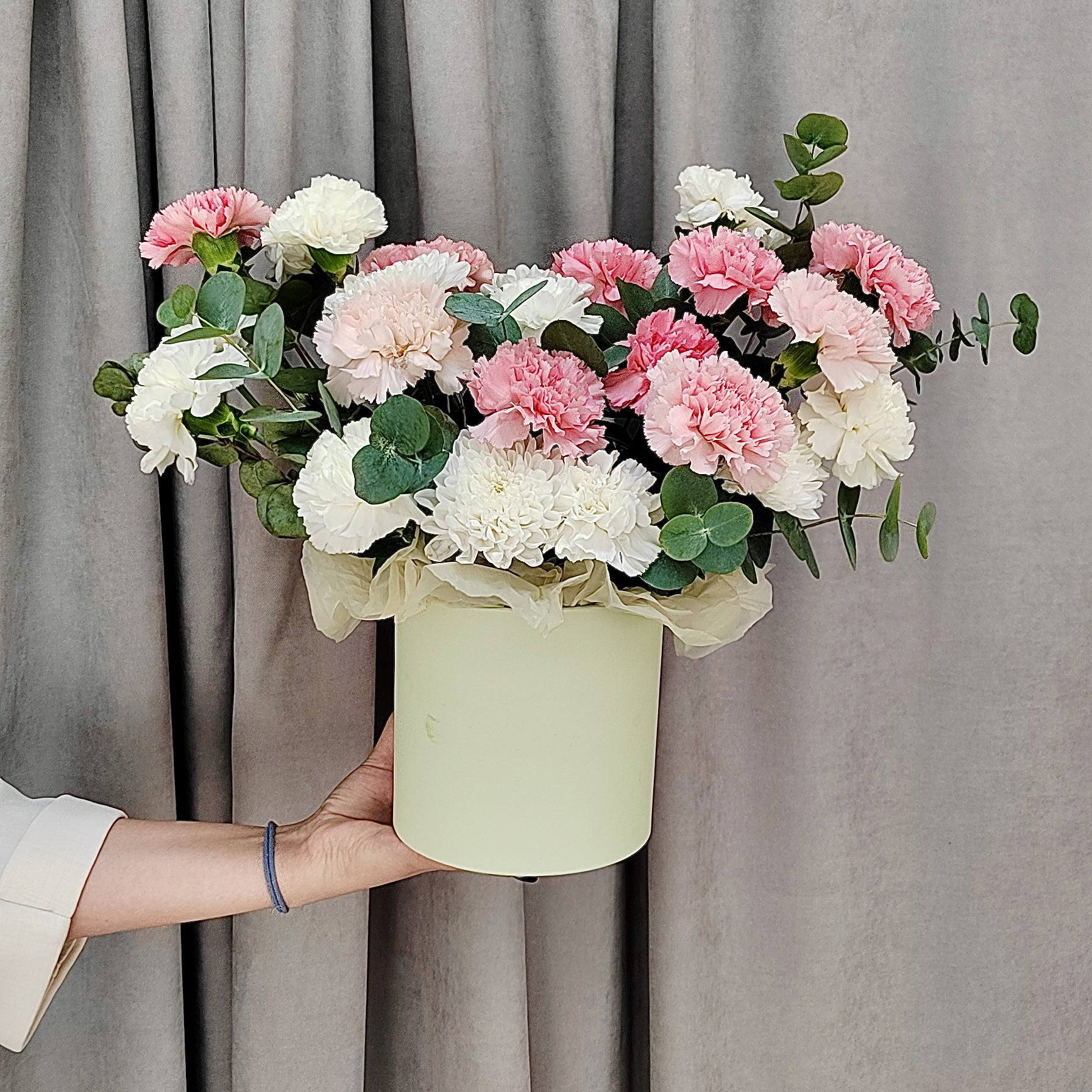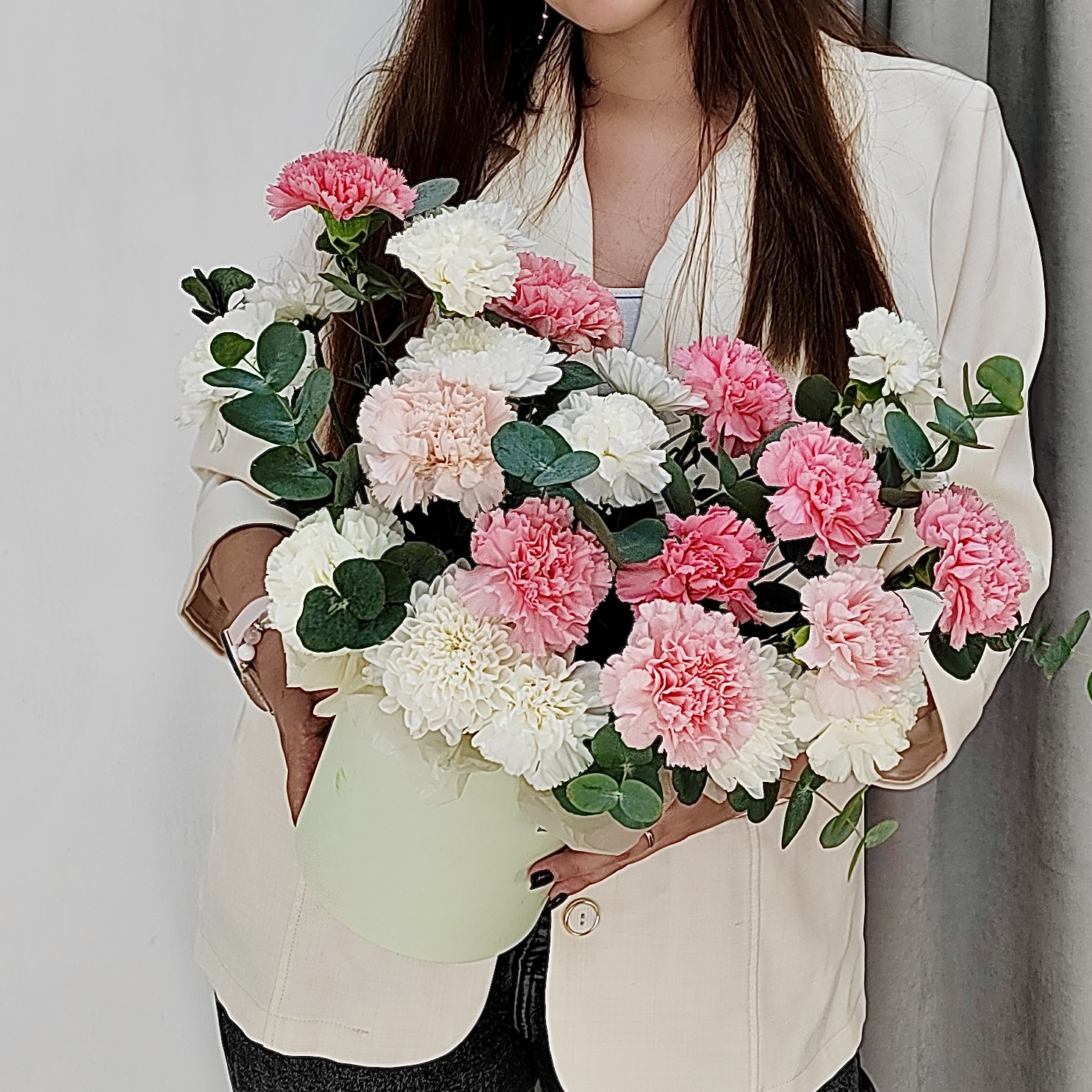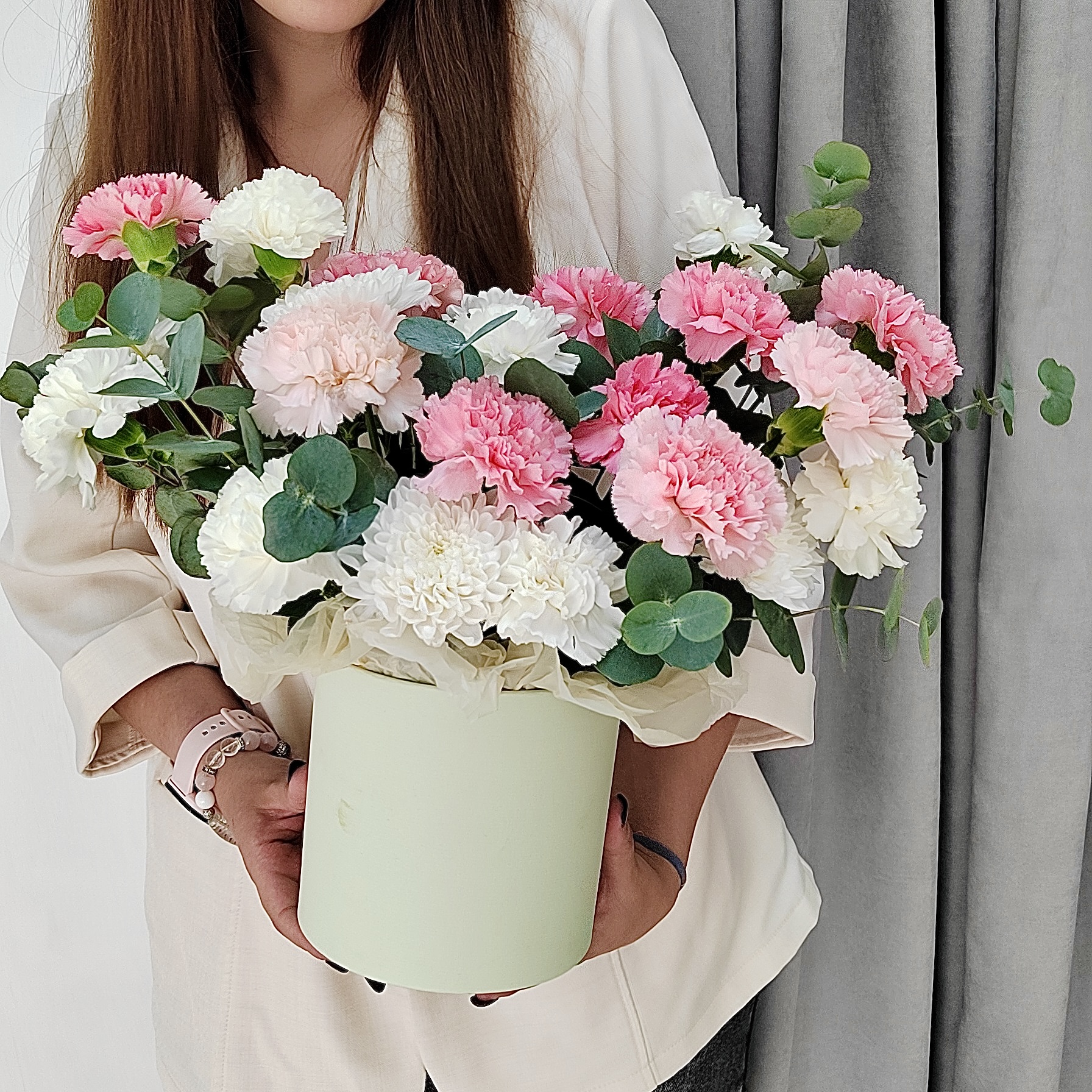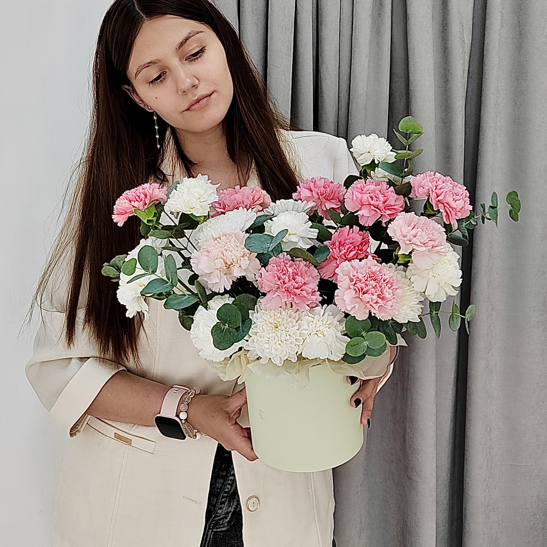 Готовая композиция в шляпной коробке | стойкие гвоздики и хризантемы