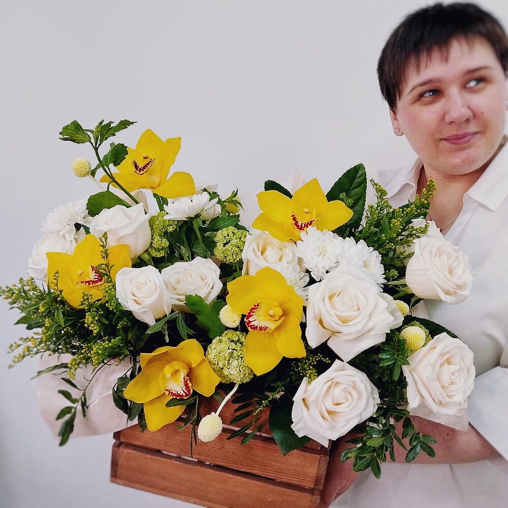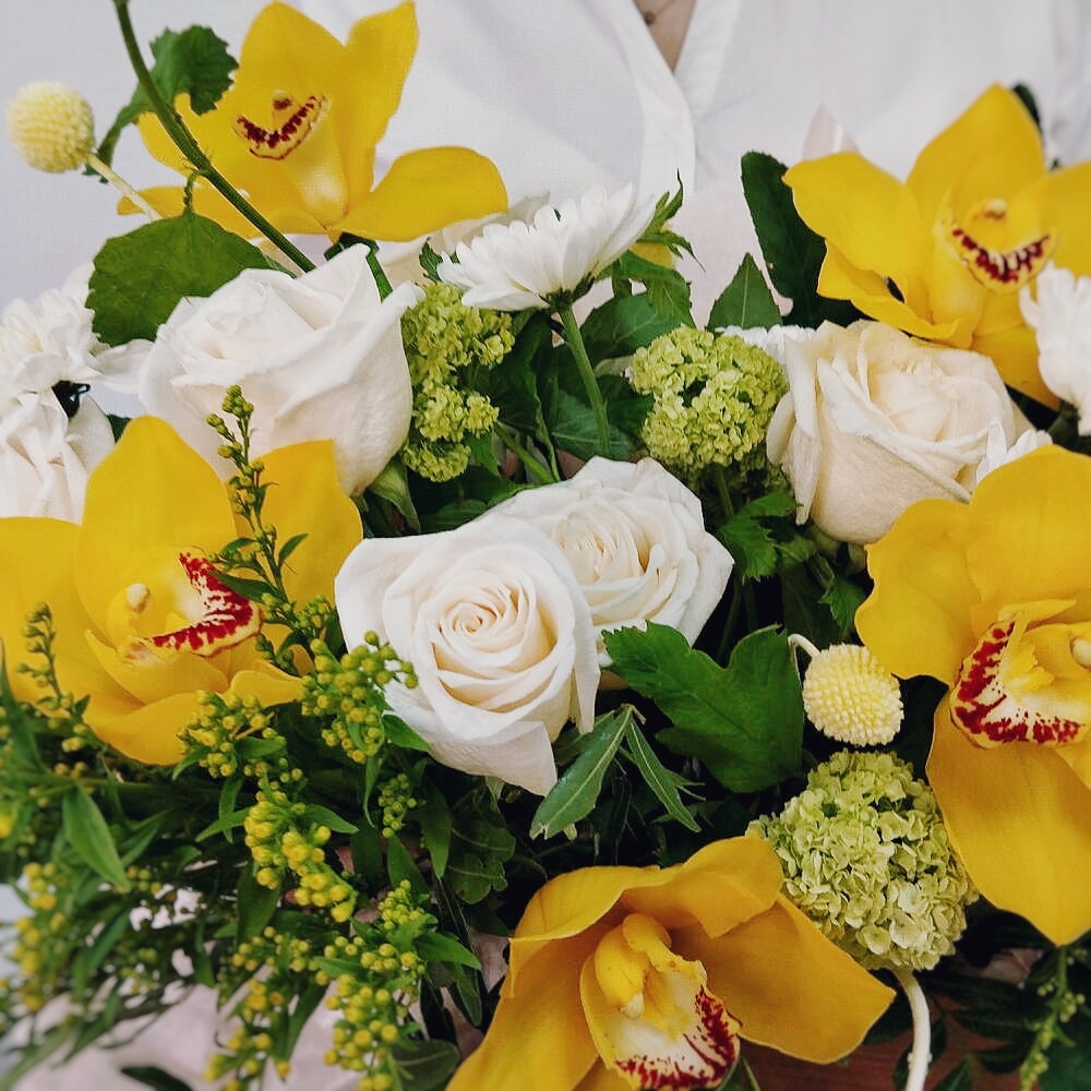 Изящные орхидеи символизируют утончённую красоту и роскошь, сочный вибурнум с его зелеными соцветиями добавляет природную динамику, пышная кустовая хризантема дарит объём и долговечность, а благородные розы привносят классическую элегантность и тонкий аромат.