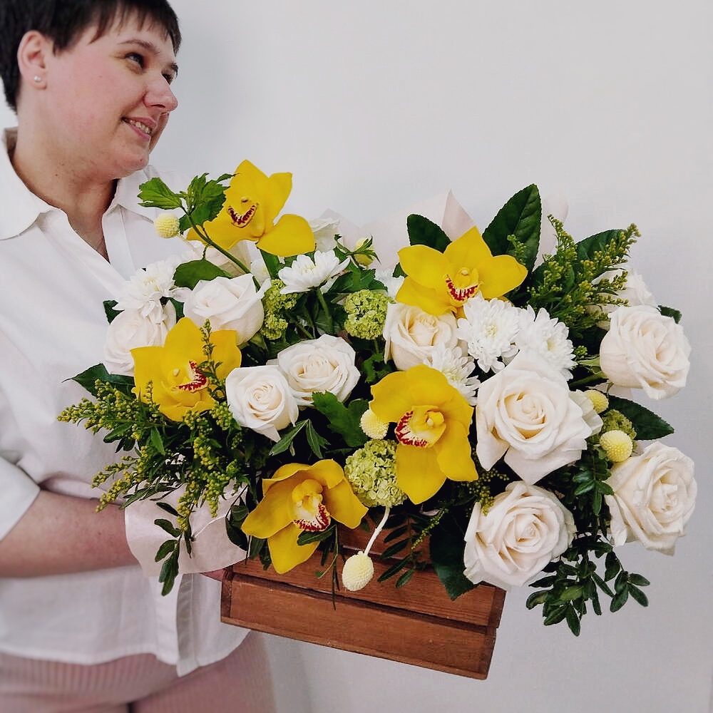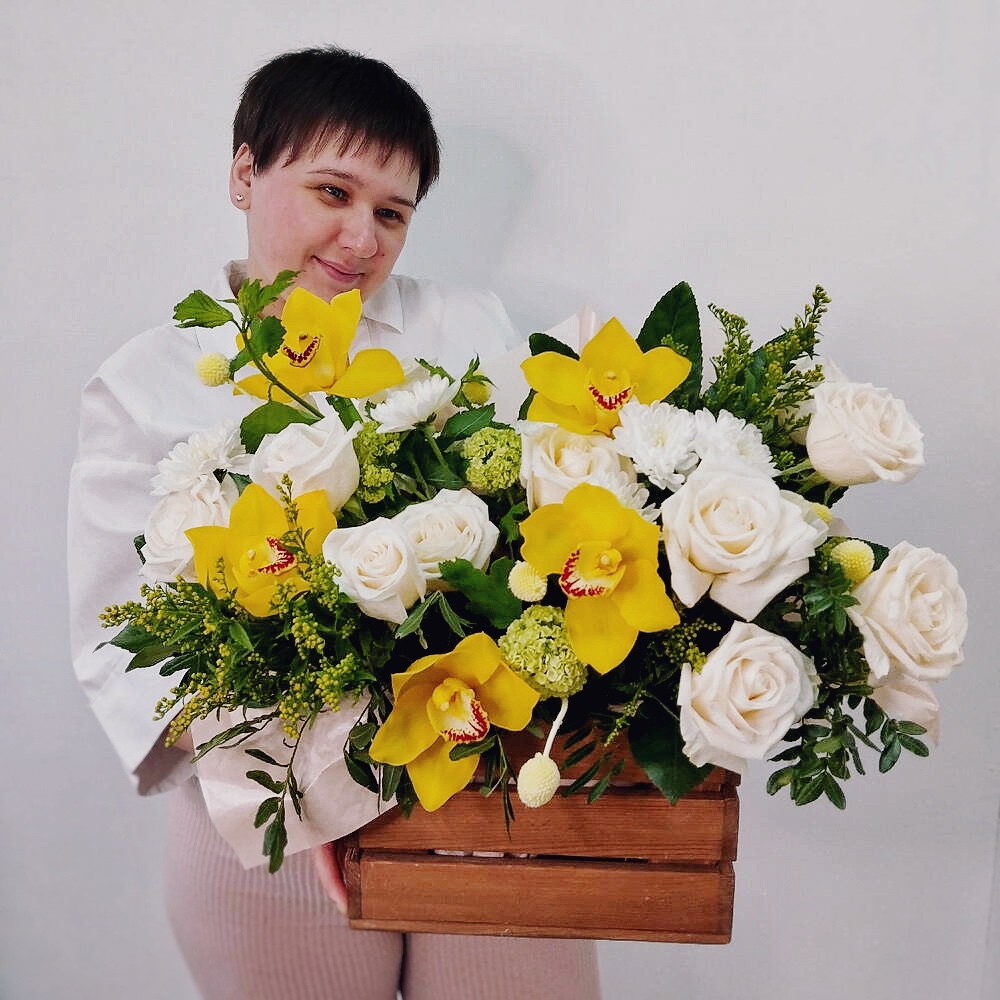 Деревянный ящик придаёт подарку эко-стильный, завершённый вид и после праздника может использоваться как органайзер или элемент декора. Благодаря флористической губке цветы дольше сохраняют свежесть и не требуют вазы.