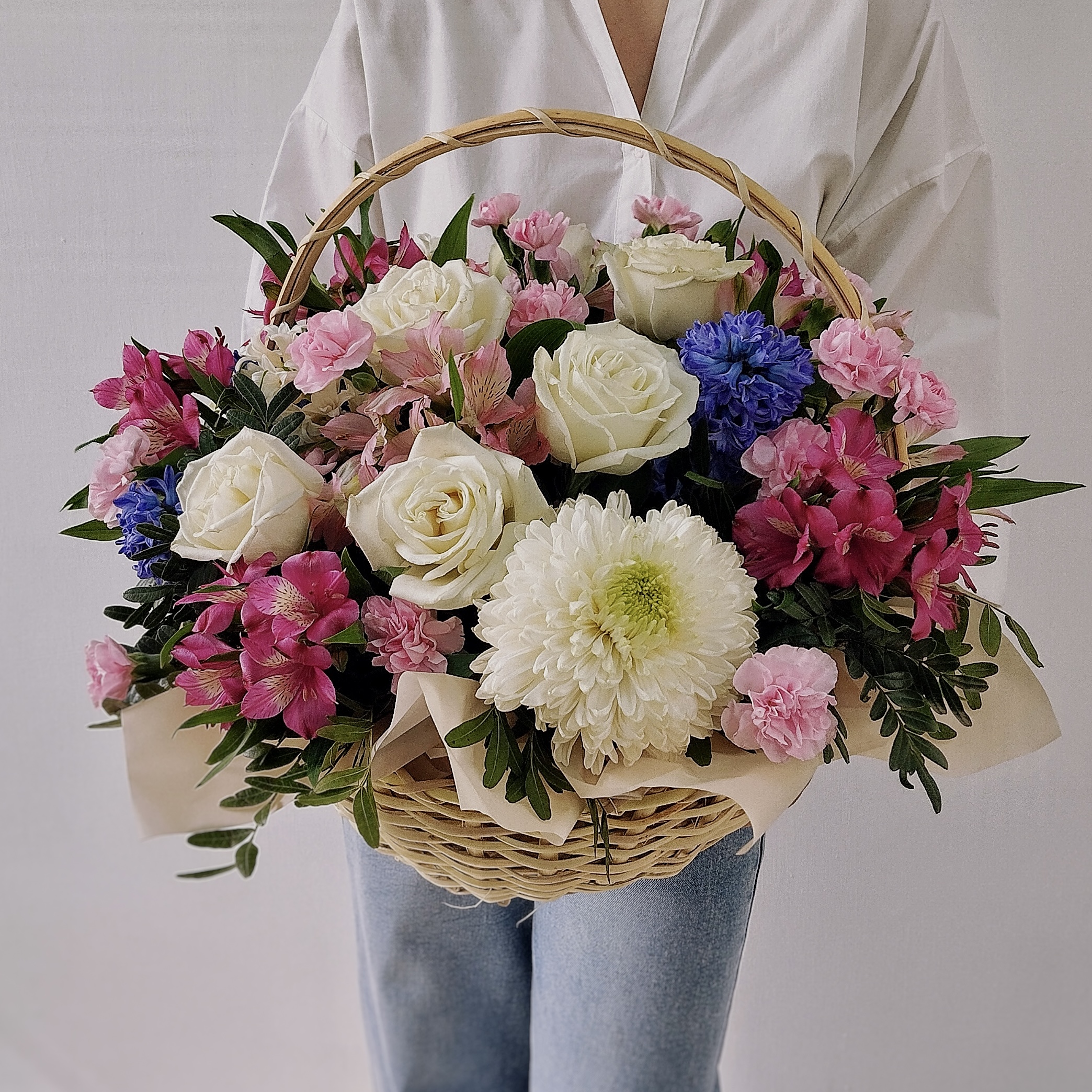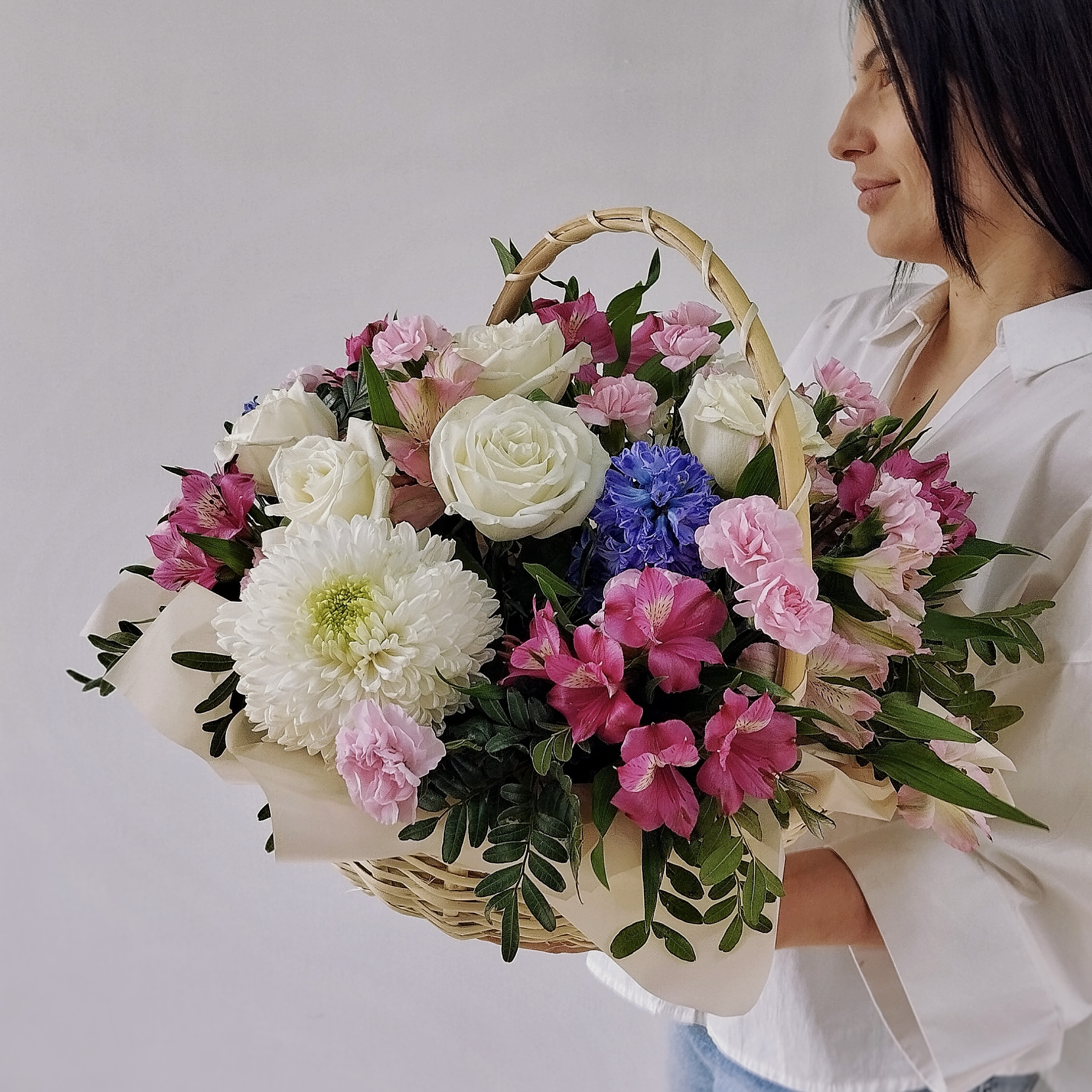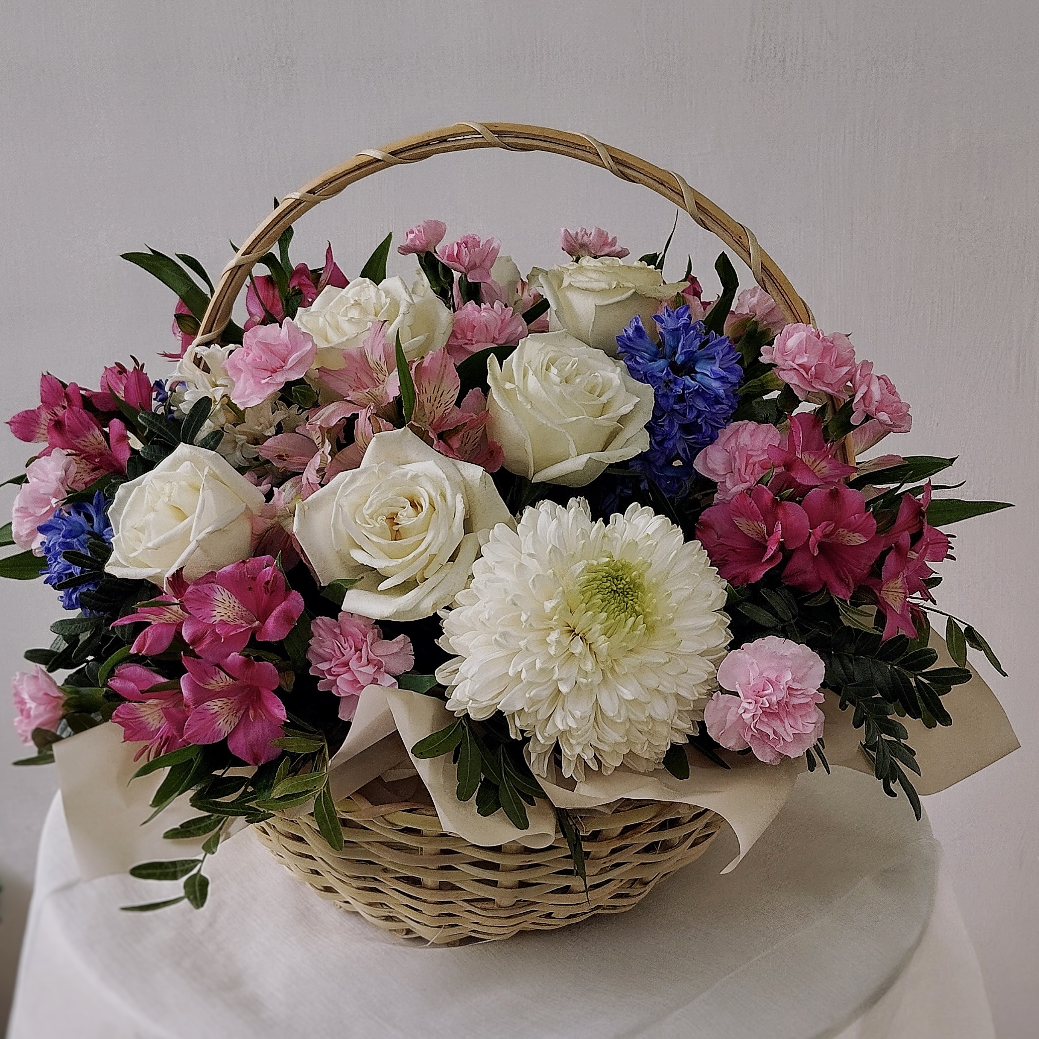Готовая корзина с белыми розами, альстромерией и хризантемой одиночной