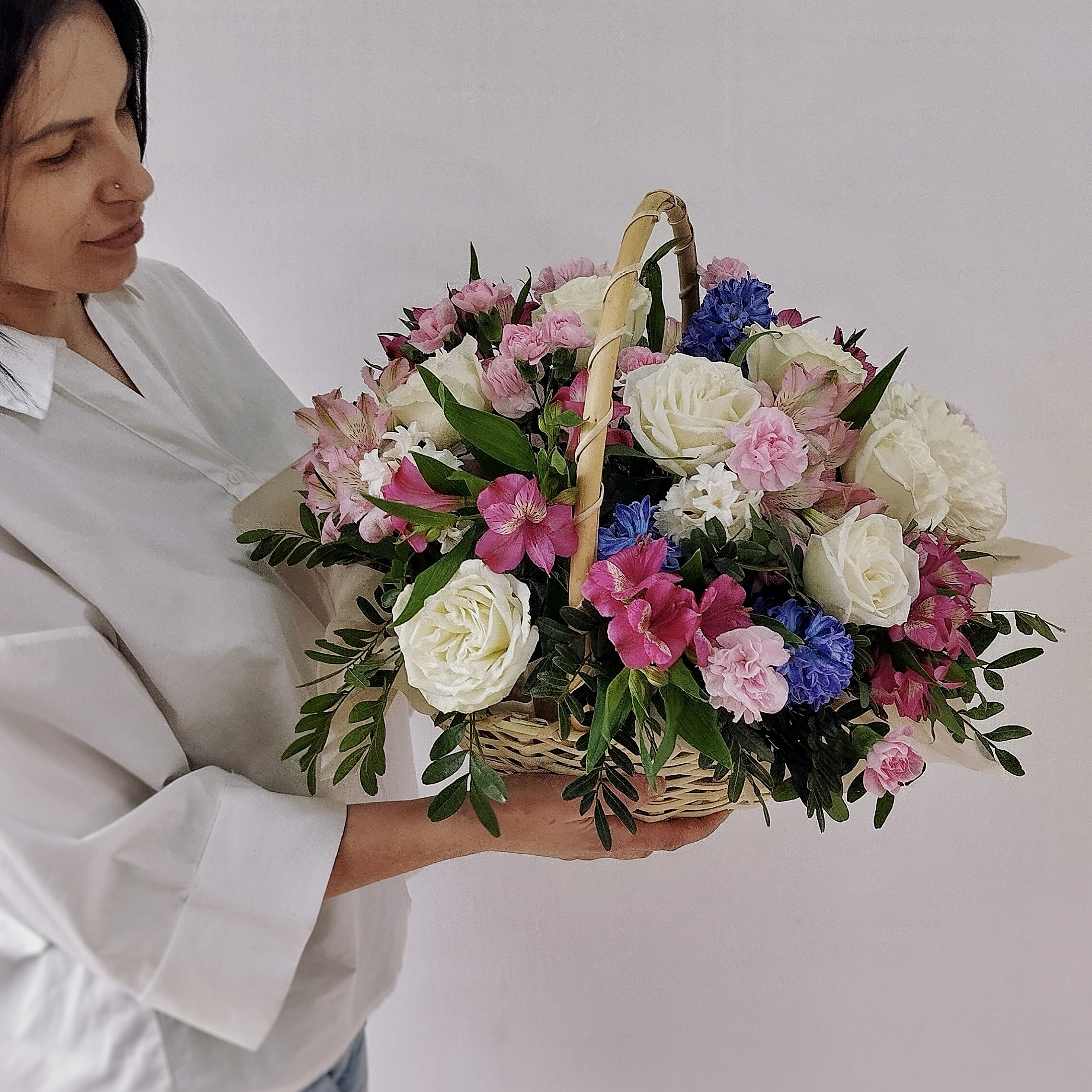 Хотите купить цветы Бердск, чтобы букет не только выглядел красиво, но и внушительного размера, при этом не требует усилий в уходе. Представляем готовую композицию с белыми пионовидными розами, стойкими альстромерией, гвоздиками и ароматными гиацинтами. Размер — 55*50 см, удобно держать в руках и дарить.