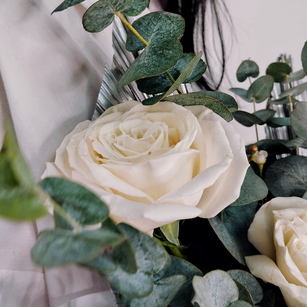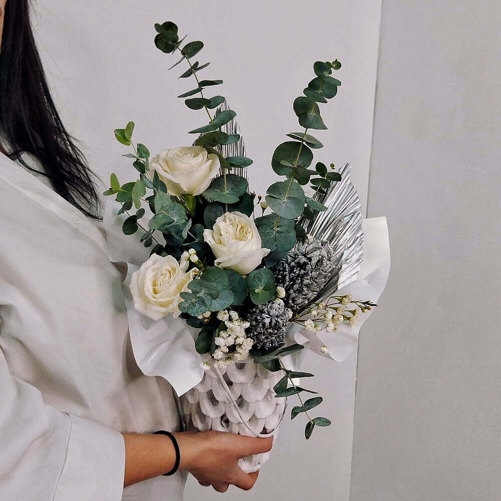 Готовая сборная композиция в античной вазе с пионовидной розой, эвкалиптом и хамелациумом