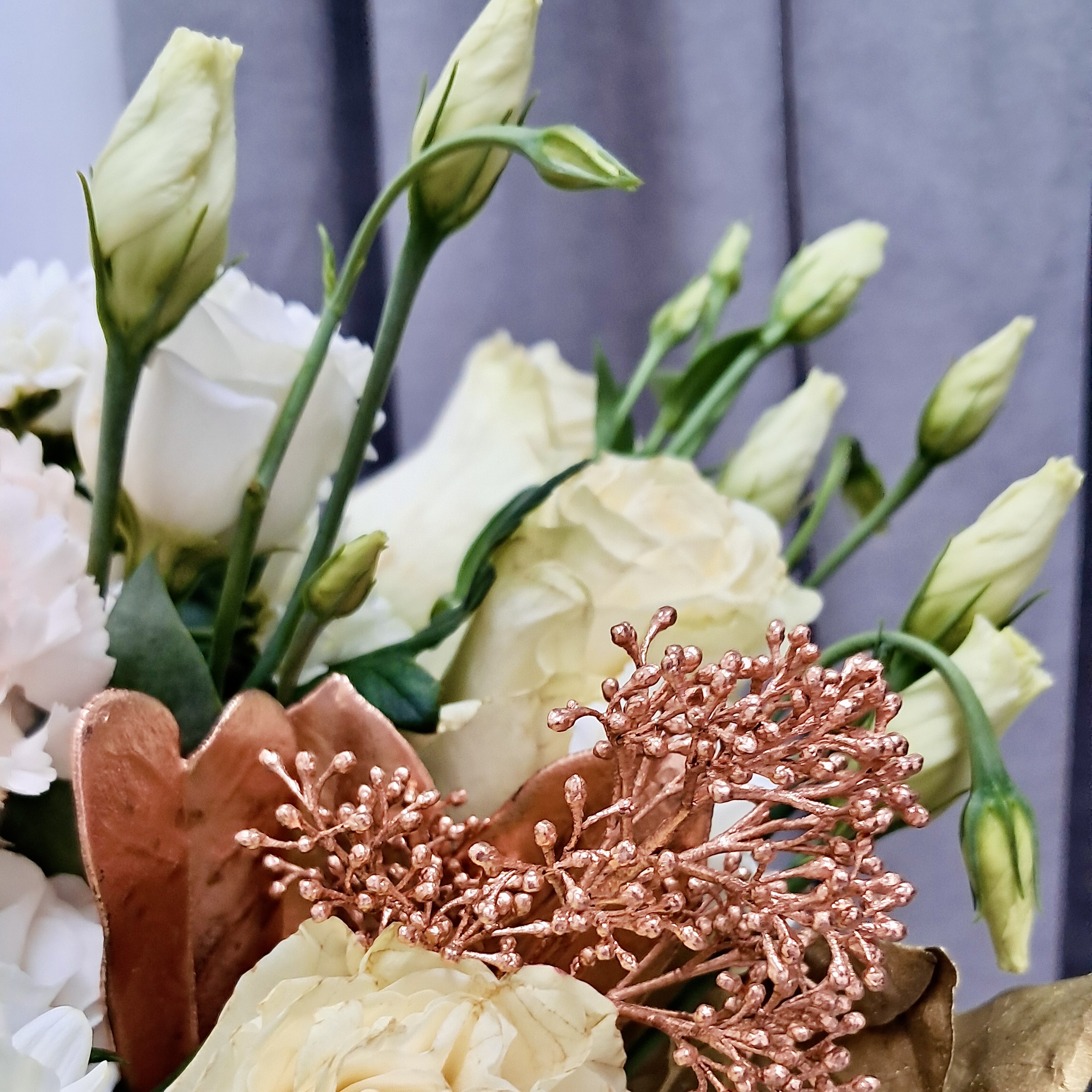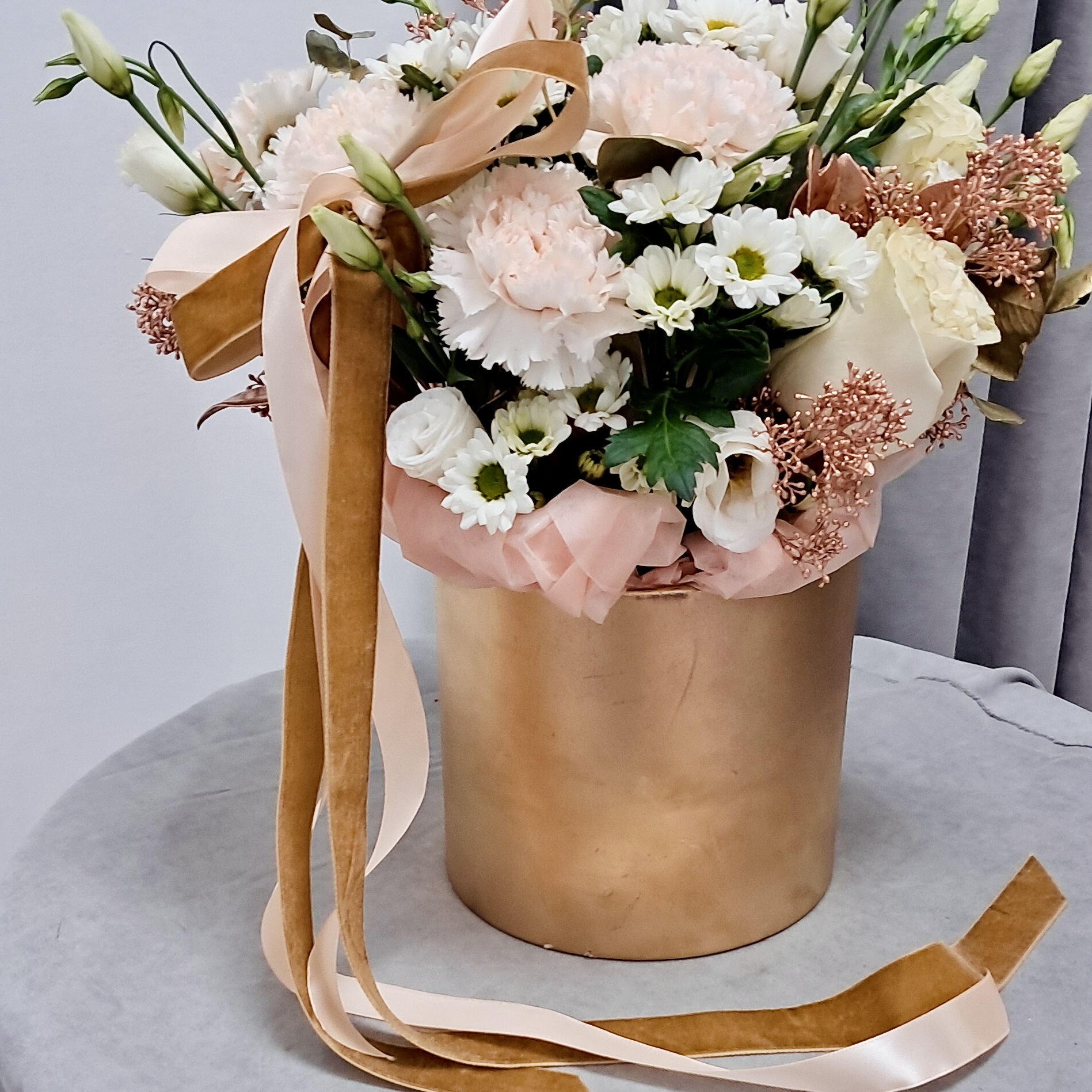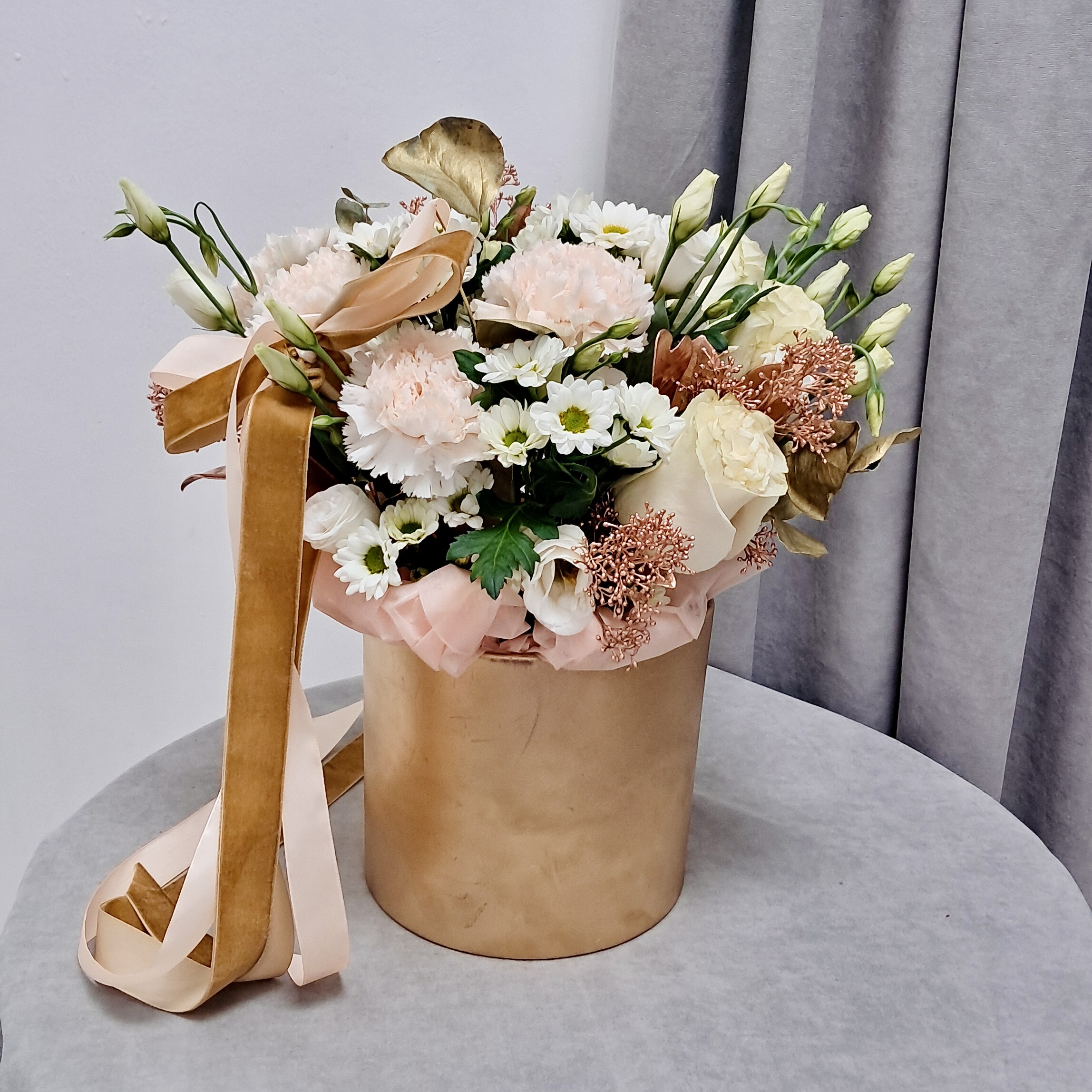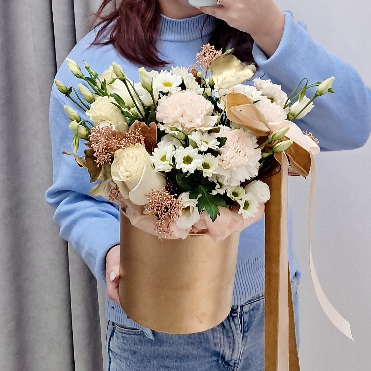 Элегантность праздника в шляпной коробке! Белые розы, искрящаяся золотая скиммия и воздушная хризантема сантини создают стильную композицию в шляпной коробке — идеальный подарок для торжественного поздравления.
