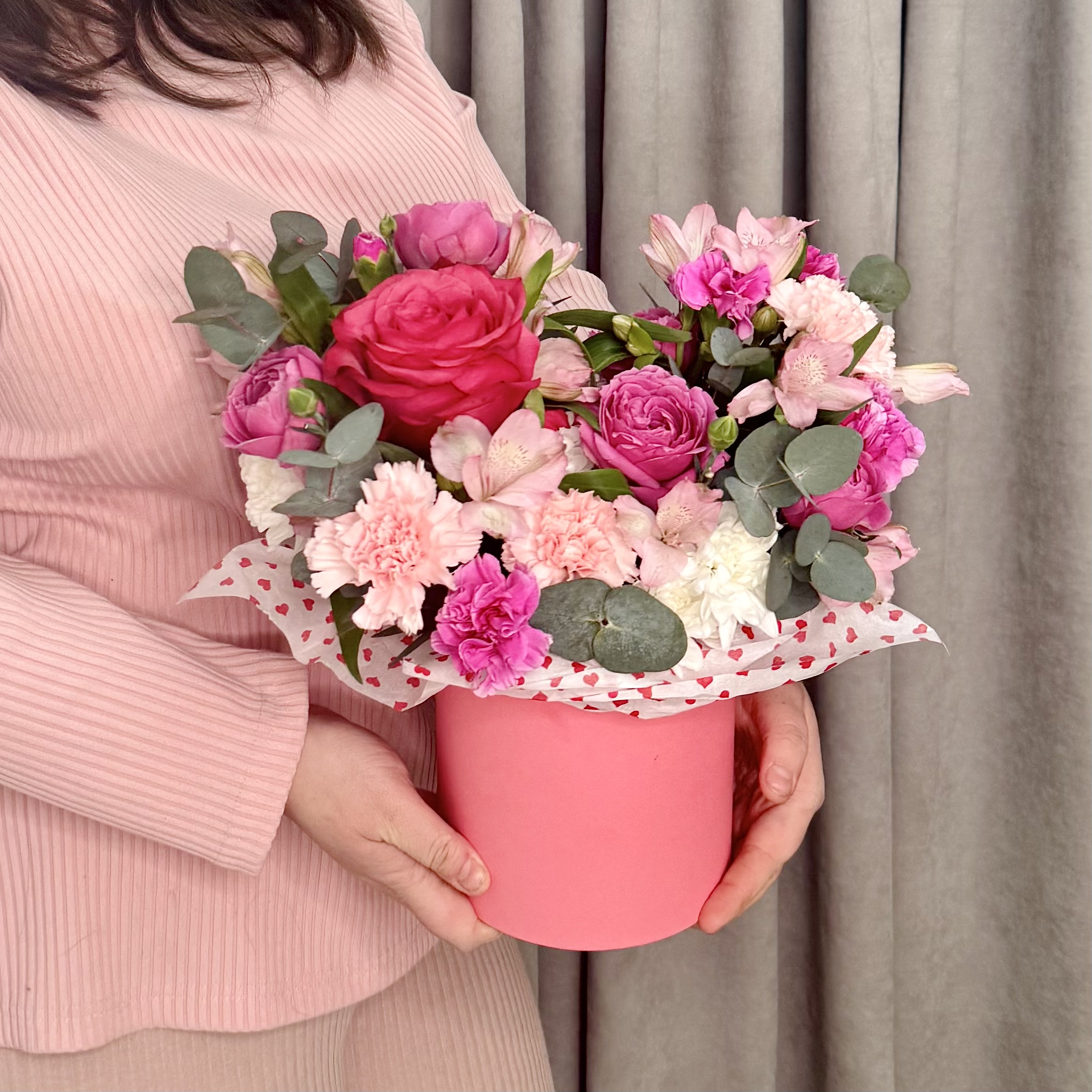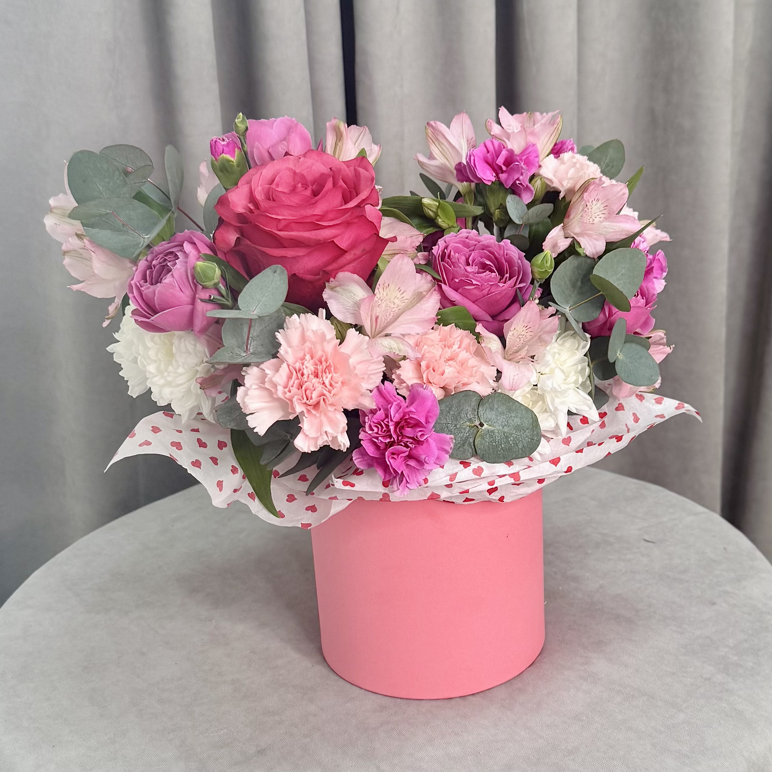 Готовая шляпная коробка с малиновой розой и розой бабл | Гвоздика, альстромерия | Размер 35/30 см