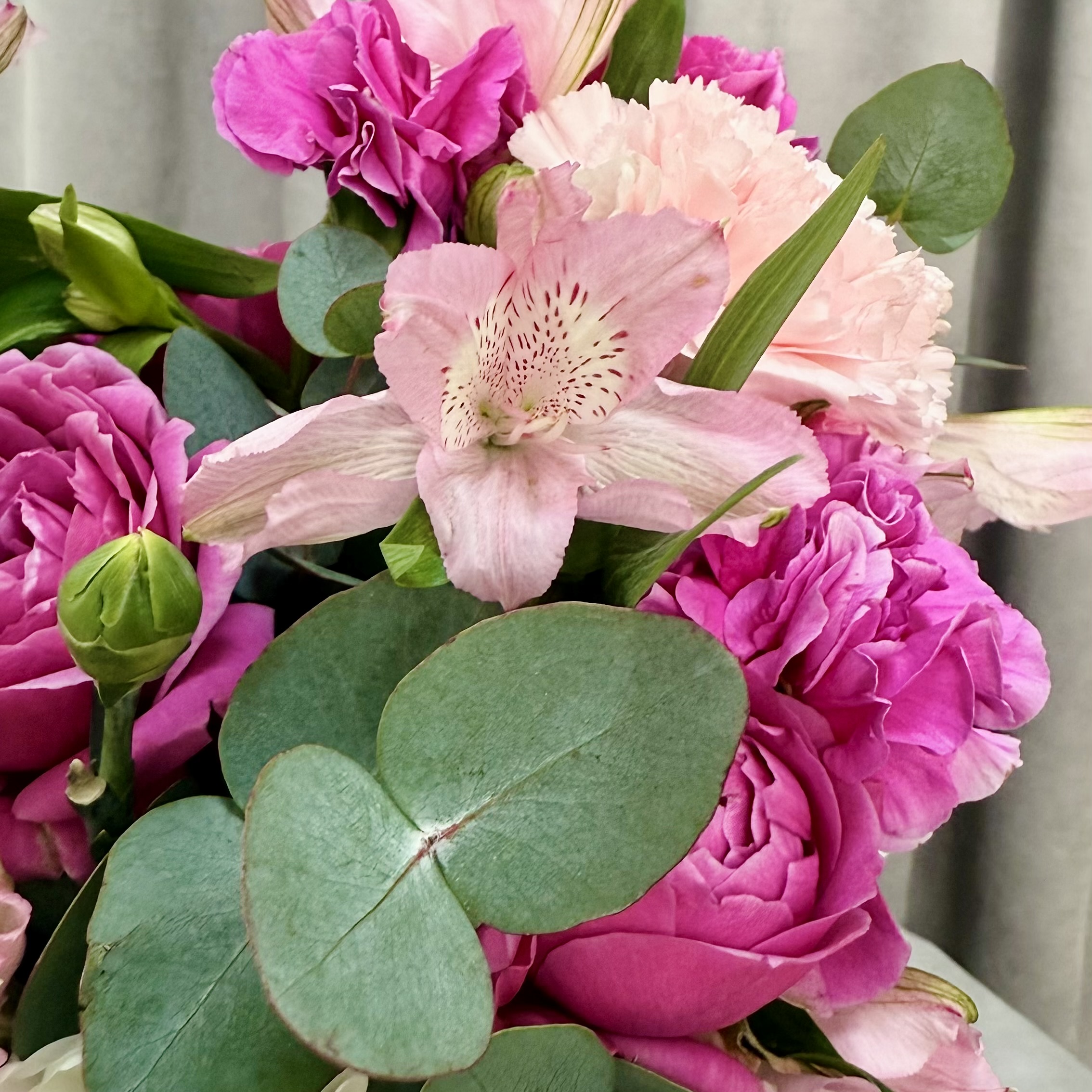 Эта сочная, стильная шляпная коробка в яркой цветовой гамме объединяет в себе роскошную малиновую розу, игривую кустовую розу бабл малинового оттенка, стойкую гвоздику и трогательную альстромерию. Композиция уже оформлена в модную шляпную коробку — не нужно думать о вазе, просто вручите и вызовите восторг! Размер 35/30 см идеально подходит для подарка — эффектно, но не громоздко.