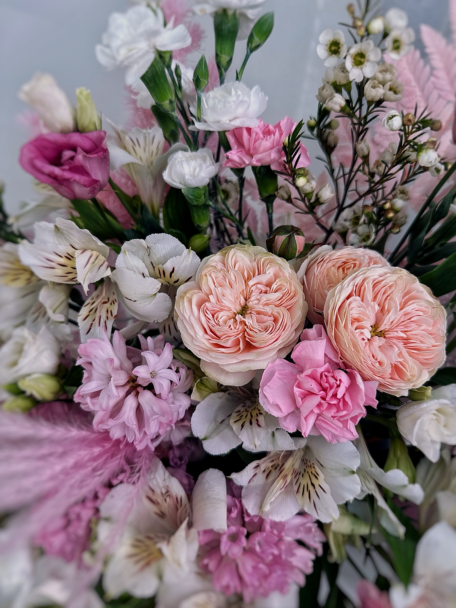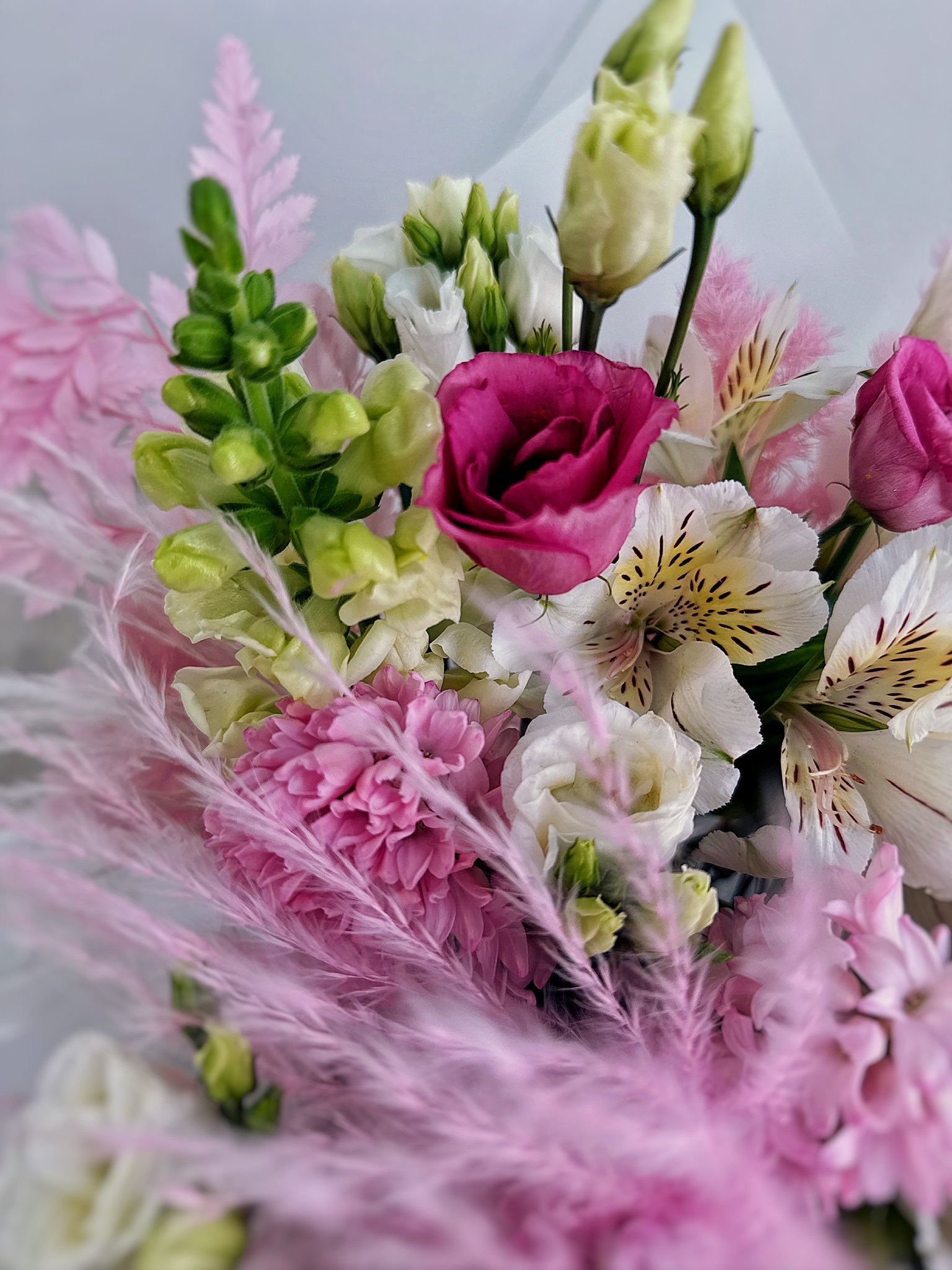 Ароматные гиацинты наполняют пространство сладким весенним запахом, изящная альстромерия добавляет композиции лёгкости и долговечности, а нежная эустома придаёт утончённость и романтичность.