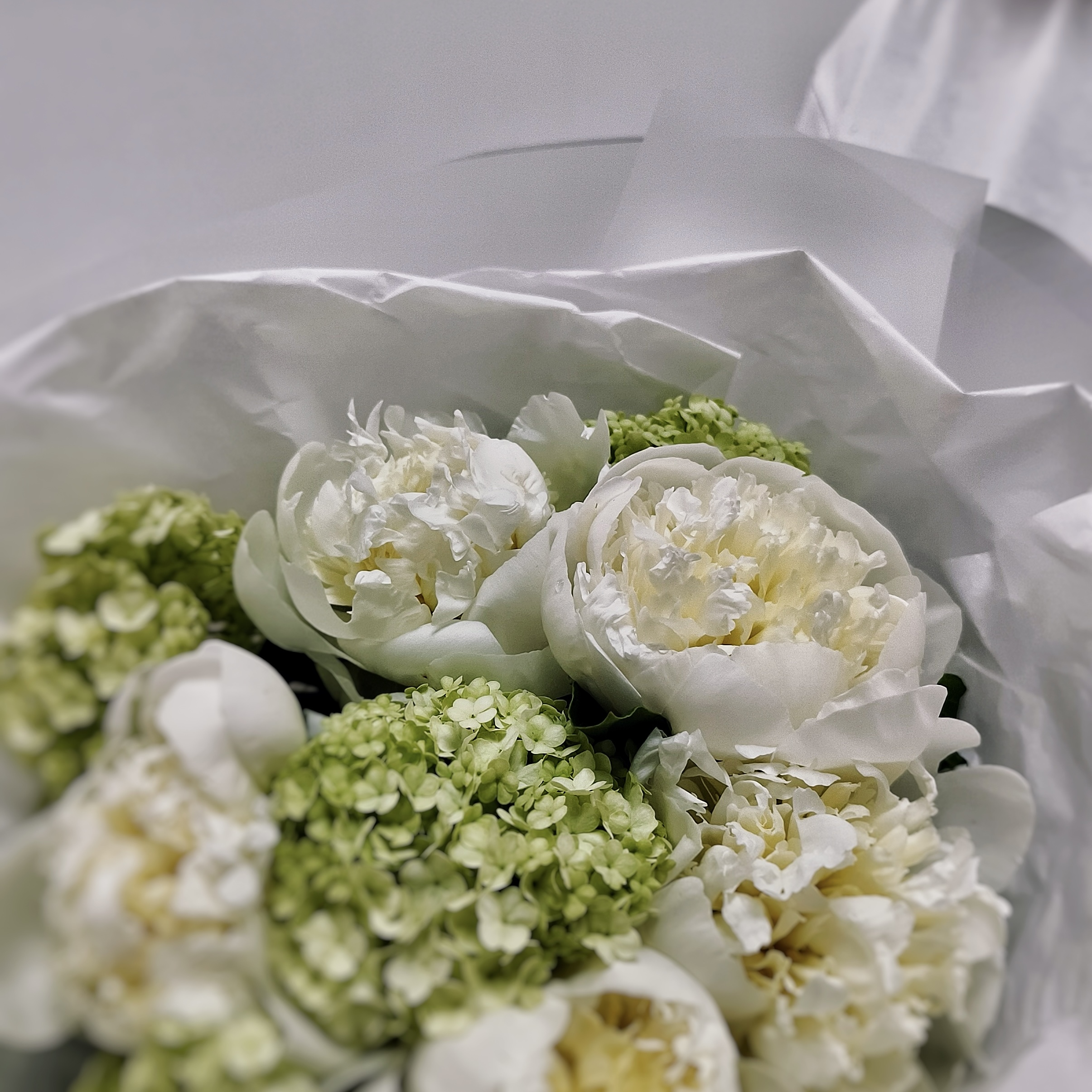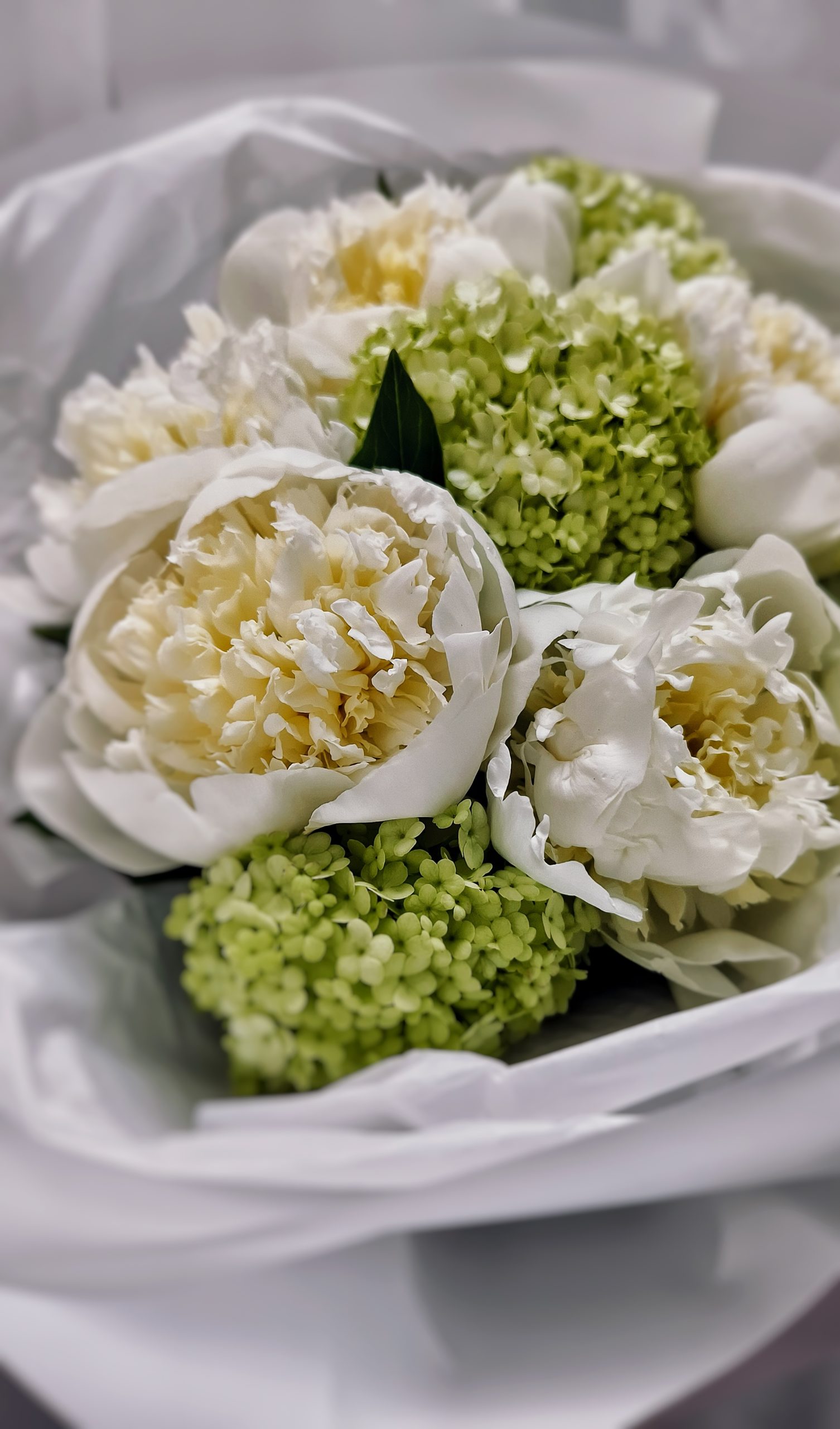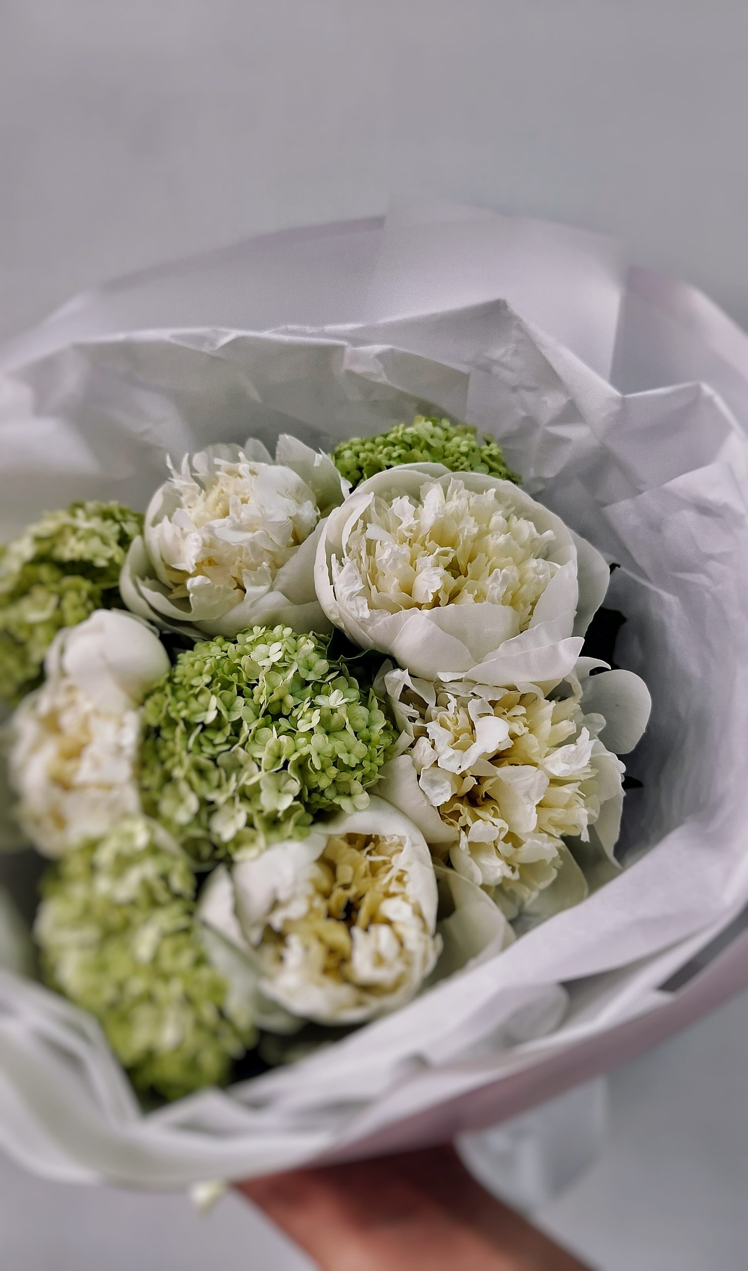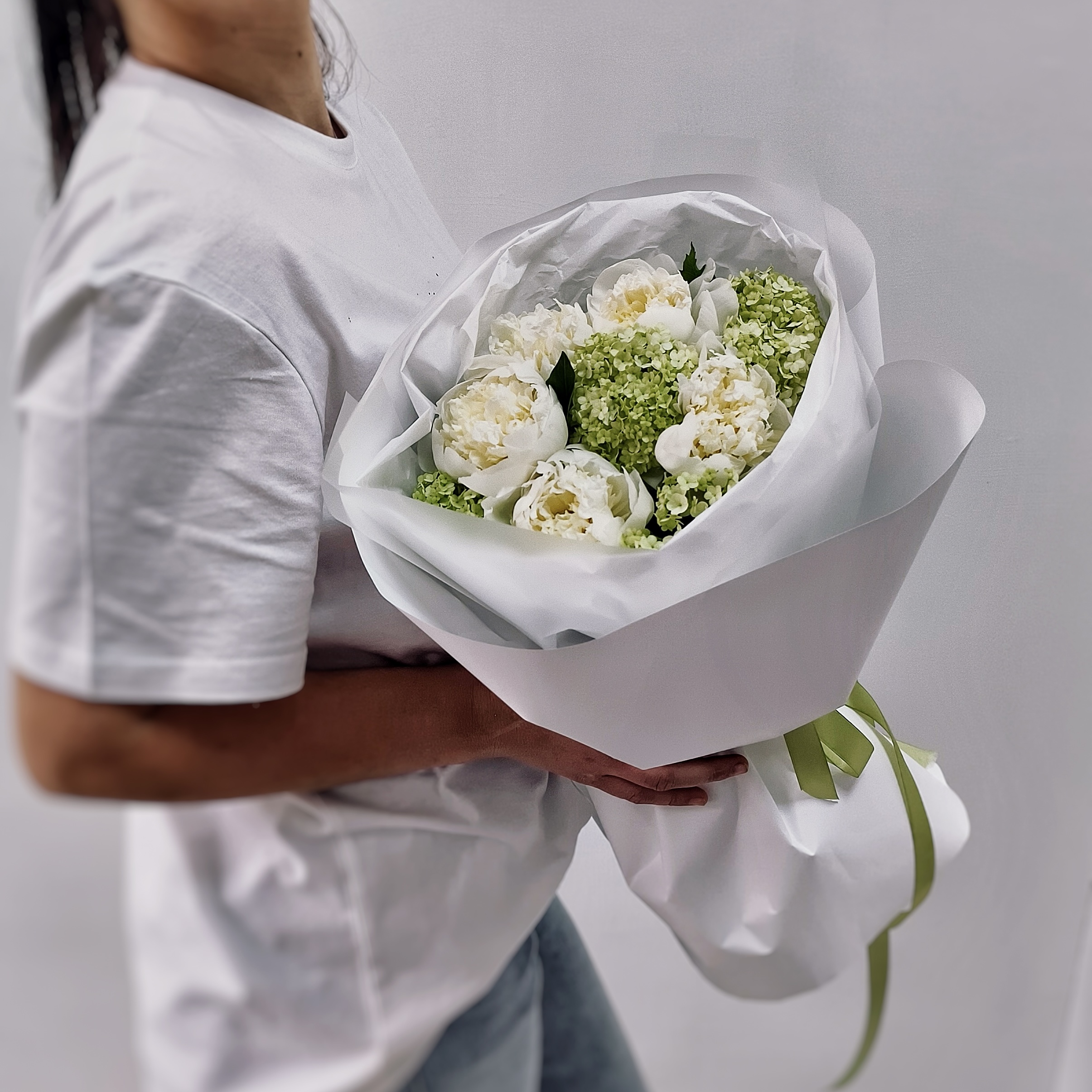 Пышные белые пионы — символ любви и благополучия, зеленый вибурнум добавляет букету лёгкости и долговечности. Вместе они создают гармоничный, воздушный образ, который идеально подойдёт для дня рождения, свидания или просто для того, чтобы порадовать близкого человека без повода.