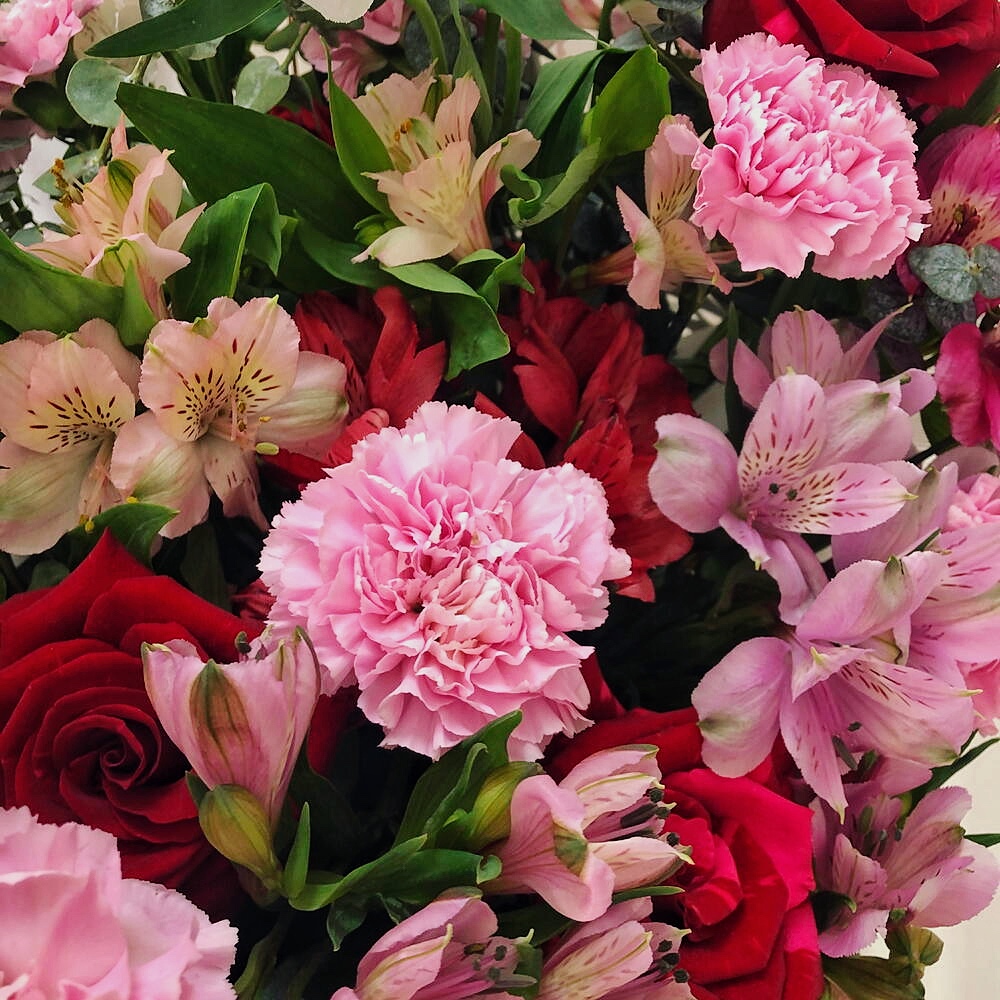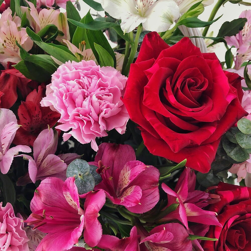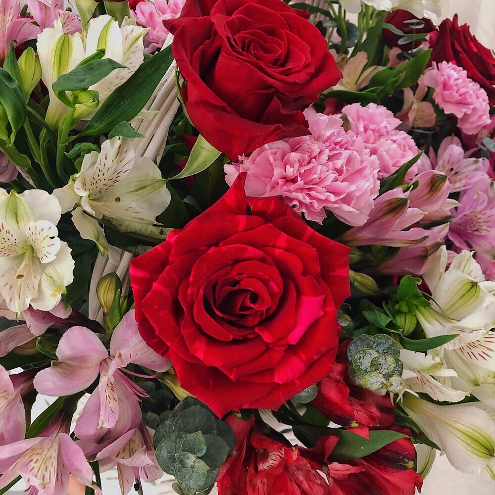В центре внимания — бордовые розы, символ глубокой любви и восхищения. Их поддерживают стойкие диантусы, известные своей долговечностью и верностью. Нежная альстромерия добавляет композиции лёгкость и символизирует преданность, а свежий эвкалипт наполняет пространство тонким ароматом. Белая плетёная корзина, контрастирующая с яркими бутонами, подчёркивает чистоту и элегантность момента, а благодаря флористической губке цветы дольше сохраняют свежесть и не требуют вазы.
