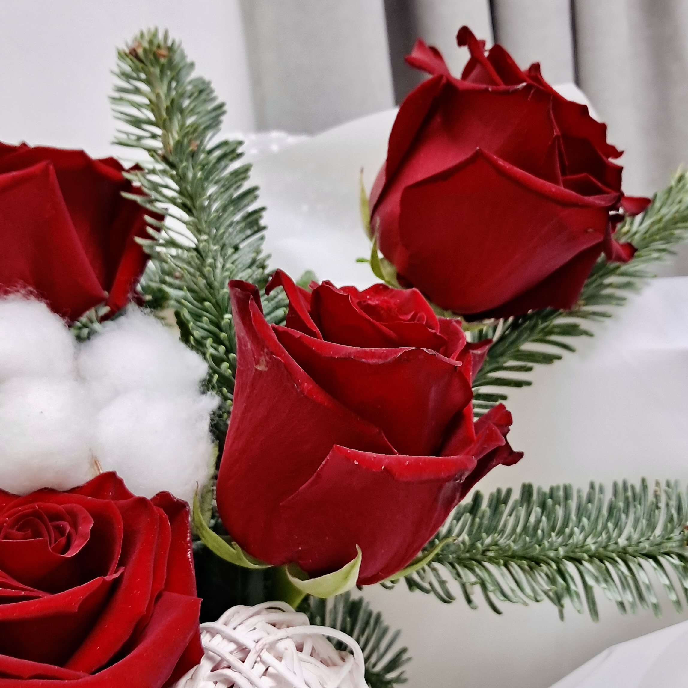 Роскошь зимы и пламя чувств в одном букете! Алые розы, серебристая голубая ель и свежая хризантема создают великолепную праздничную композицию, полную контрастов, страсти и зимней магии.