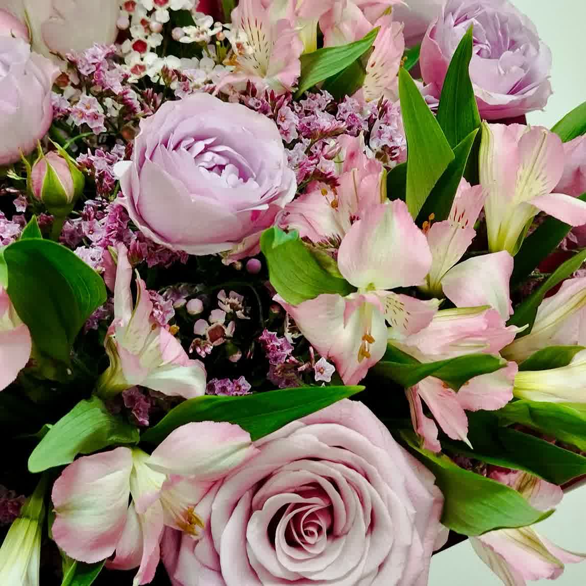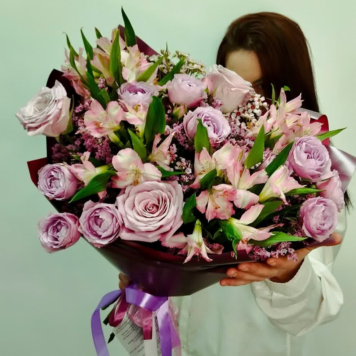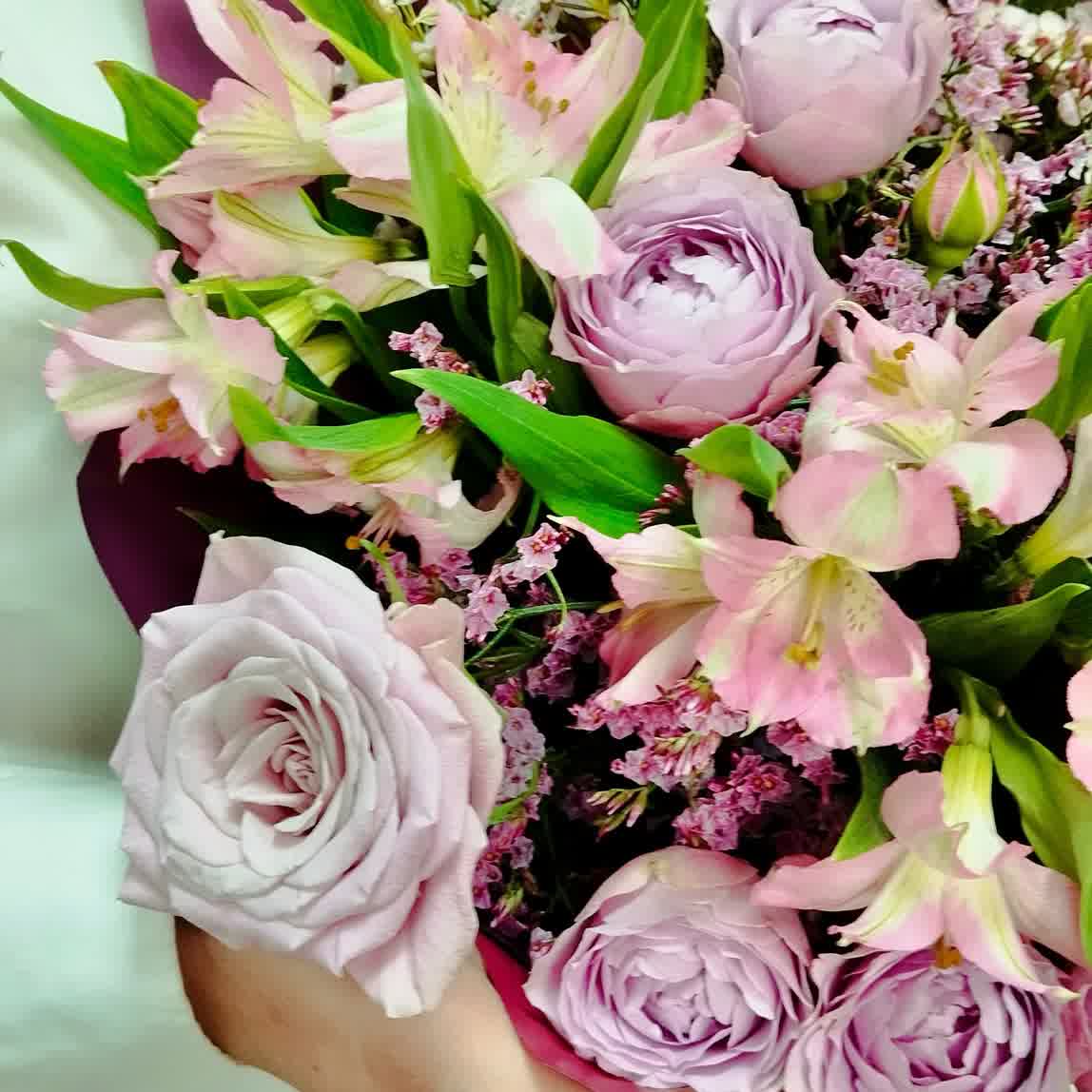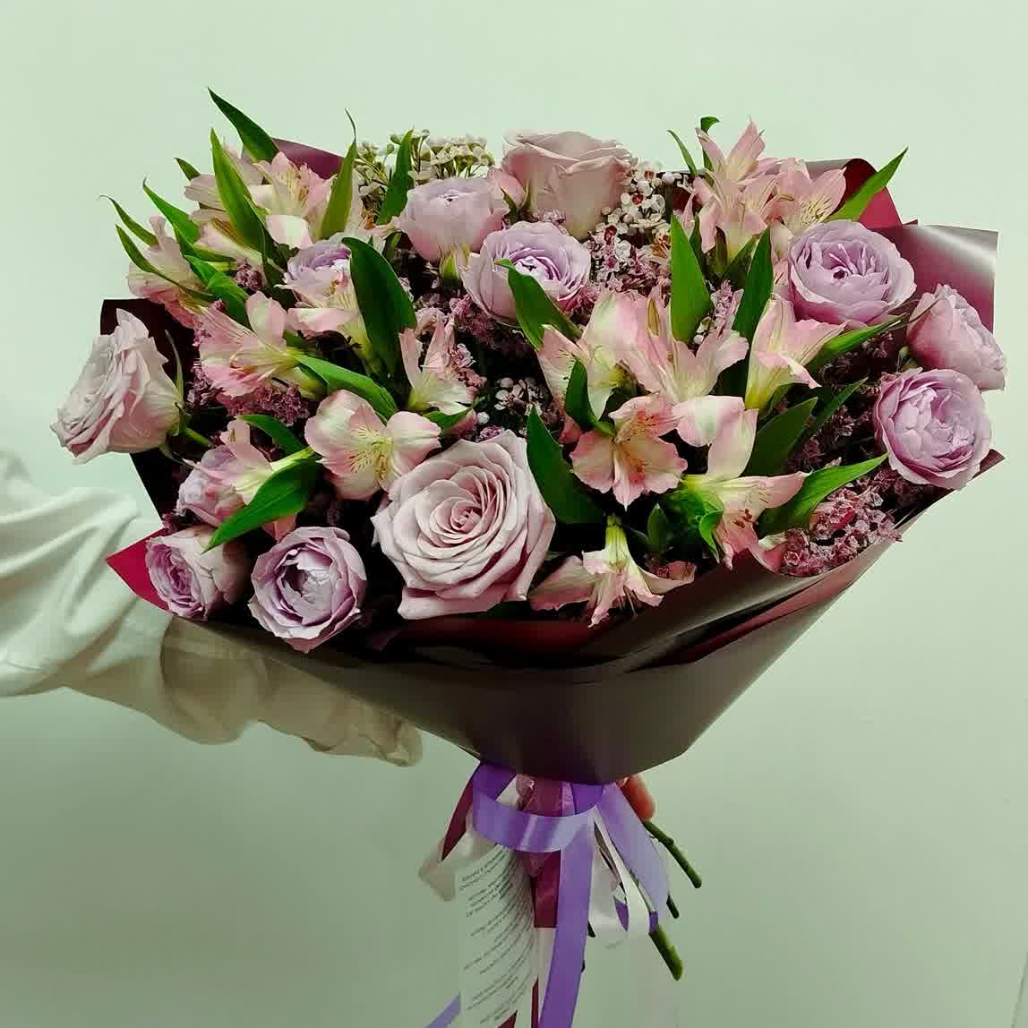Готовый букет из пионовидных роз, альстромерии и лимониума в сиреневом цвете.