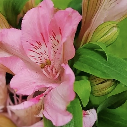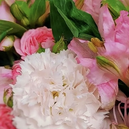 Главное преимущество этой композиции — удивительная стойкость. Альстромерии и гвоздики способны радовать свежестью до двух недель, а пионовидная роза будет постепенно раскрываться, напоминая о вашем подарке снова и снова.